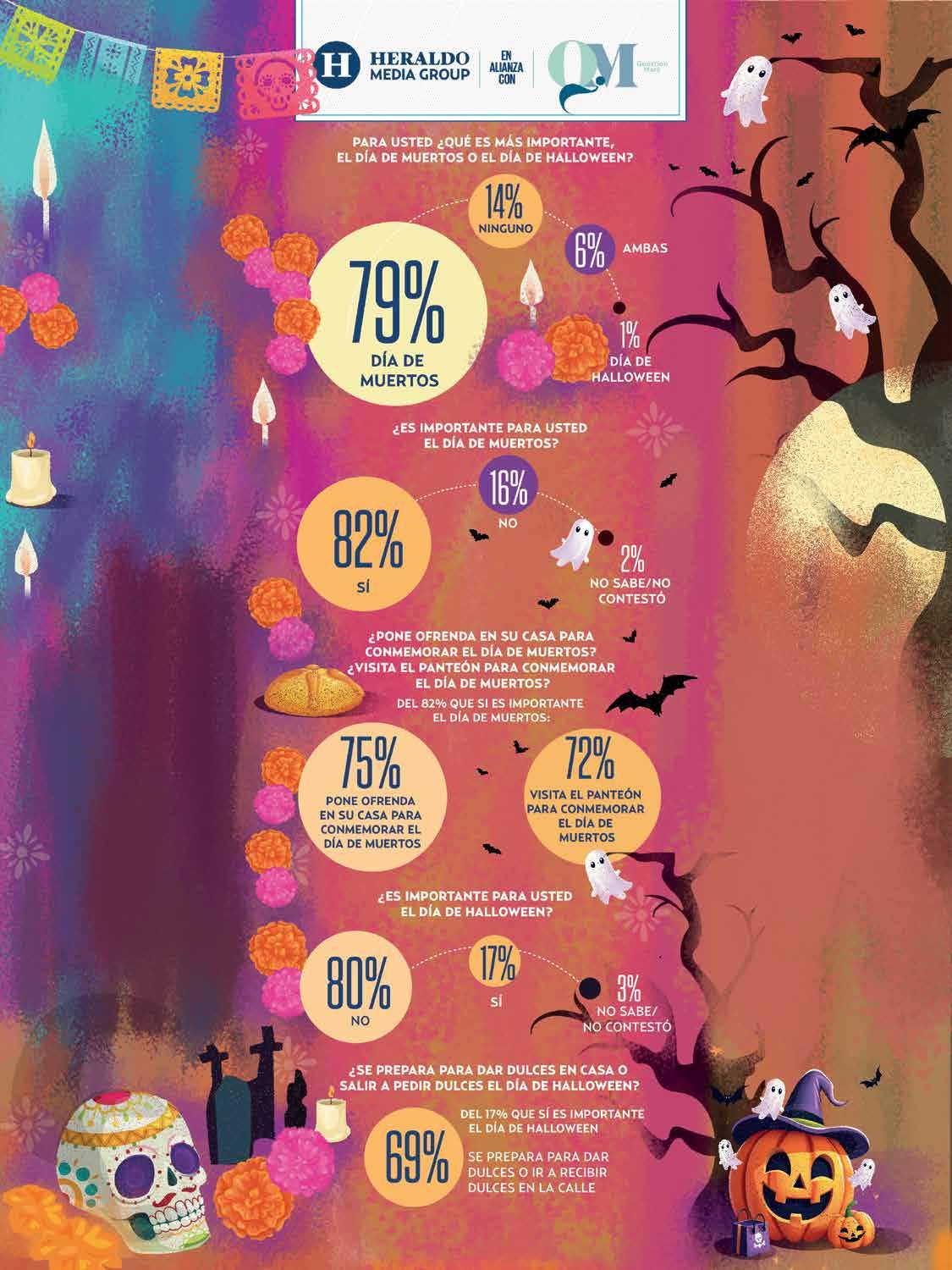 Con el paso del tiempo, la fiesta dedicada a los difuntos se ha convertido en una de las importantes en México, de acuerdo con QM Estudios de Opinión, en alianza con Heraldo Media Group, el 79 por ciento de los mexicanos la prefiere por encima de cualquier otra festividad, incluído el Halloween o el Día de Brujas, de origen estadounidense y relacionado más con las historias de terror, los disfraces tétricos y niños que van de casa en casa exigiendo dulces a cambio de no ejecutar un truco, es decir, una travesura.