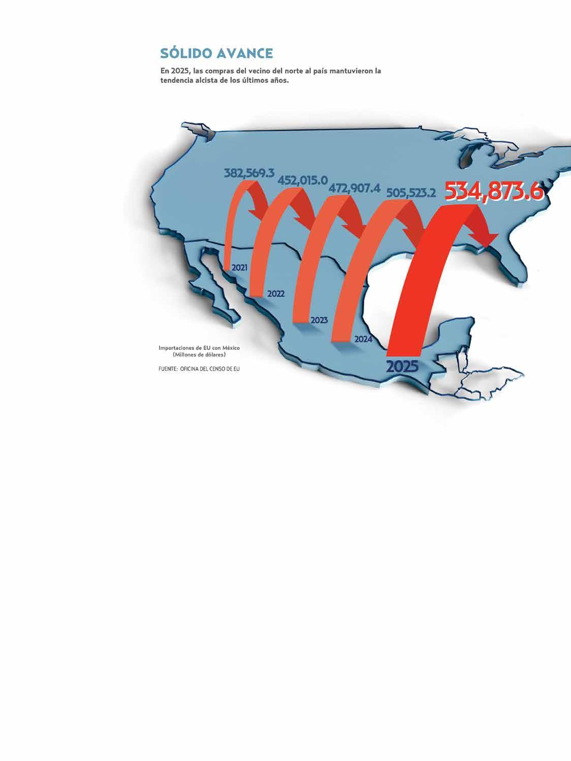 Totalizaron 534 mil 873.6 mdd, en 2025, con un crecimiento de 5.81% anual; el país sumó tres años consecutivos como principal socio comercial de la Unión Americana, según cifras de la Oficina del Censo