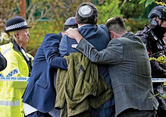 l CRUMPSALL. Miembros de la comunidad judía británica se consolaban cerca de la sinagoga atacada.