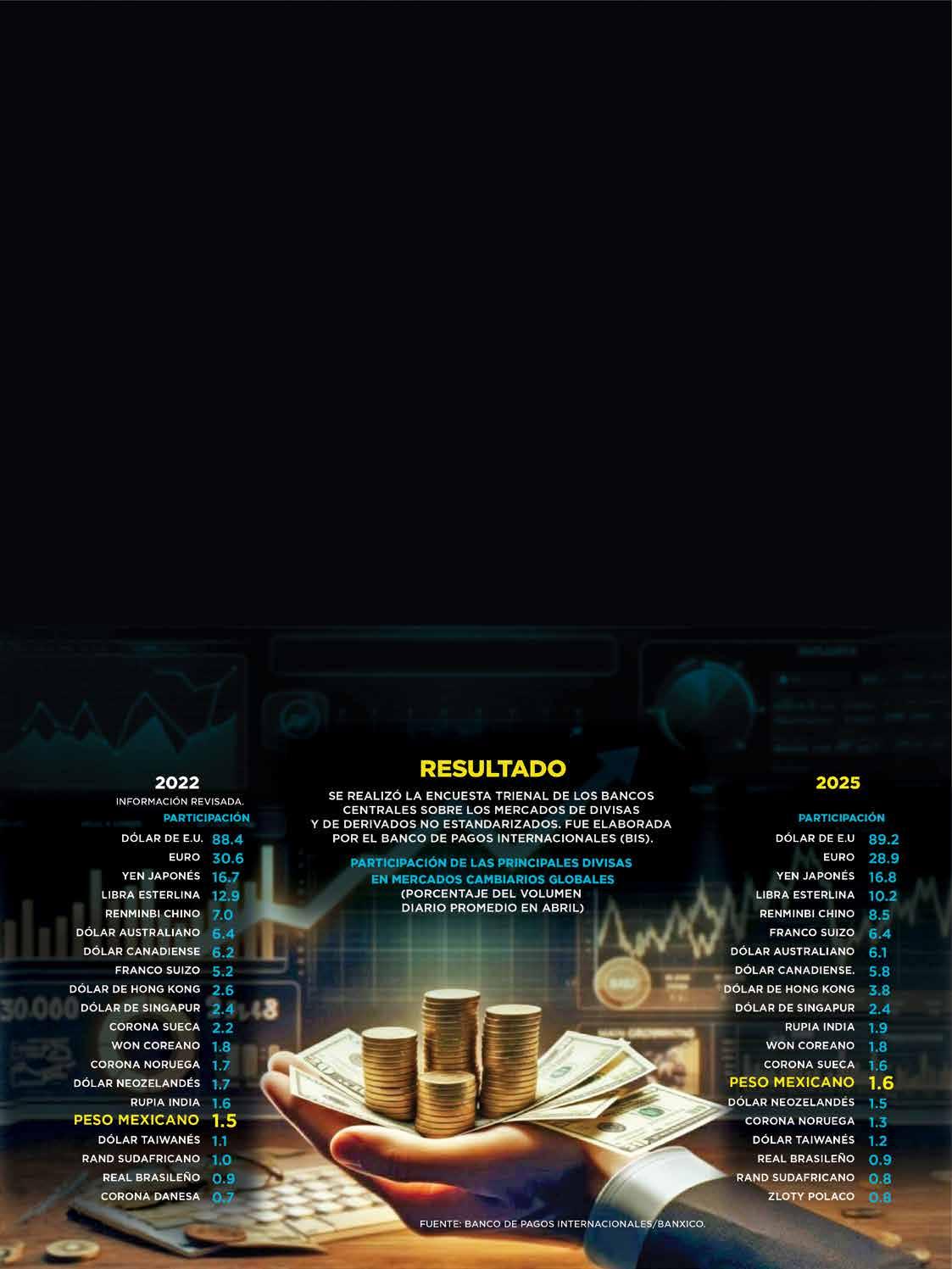 pasar de 1.5 por ciento en 2022 a 1.6 por ciento en 2025, de acuerdo con la encuesta del BIS. La encuesta también mostró que 82 por ciento de las operaciones con cruce con el peso mexicano se llevan a cabo fuera del territorio nacional, sin cambios respecto a la encuesta previa, debido a que las transacciones del ocurren durante las 24 horas del día.