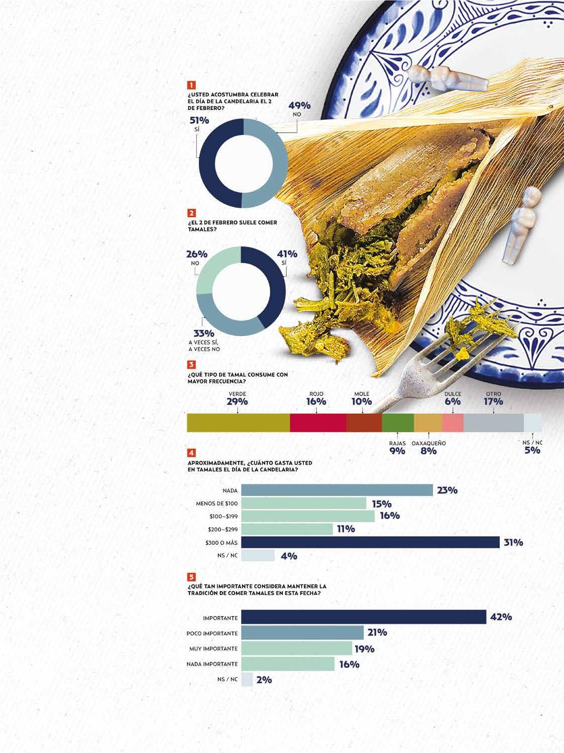 A la pregunta “¿El 2 de febrero suele comer tamales?”, 41 por ciento indicó que sí; 33 por ciento expresó que “a veces sí, a veces no” y 26 por ciento dijo que no los ingiere.