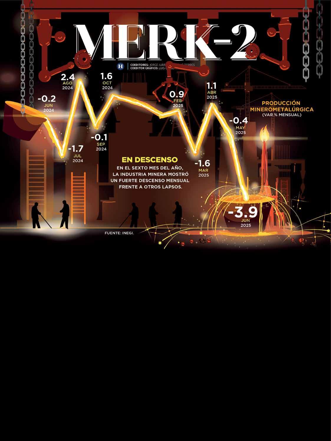 La producción minerometalúrgica de México registró un descenso en junio de 2025 de 3.9 por ciento con respecto a mayo pasado, de acuerdo con cifras del Instituto Nacional de Estadística y Geografía (Inegi).