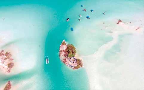 Cerca de la frontera con Belice, la Laguna de los Siete Colores es un santuario crucial para algunas de las formas de vida más antiguas de la Tierra. La laguna se extiende a lo largo de unos 42 kilómetros y se caracteriza por un espectro de tonalidades azules que varían según la profundidad, la composición del suelo y la reflexión solar. A su alrededor, una serie de pequeños hoteles se integra al paisaje y los esfuerzos de conservación.