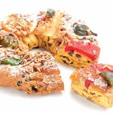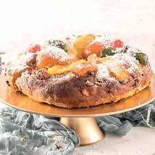 l Un pan esponjoso adornado muy festivamente con fruta confitada. En él se esconden dos diferentes objetos durante su preparación: figuras de los tres reyes magos o del niño Jesús, y un haba.