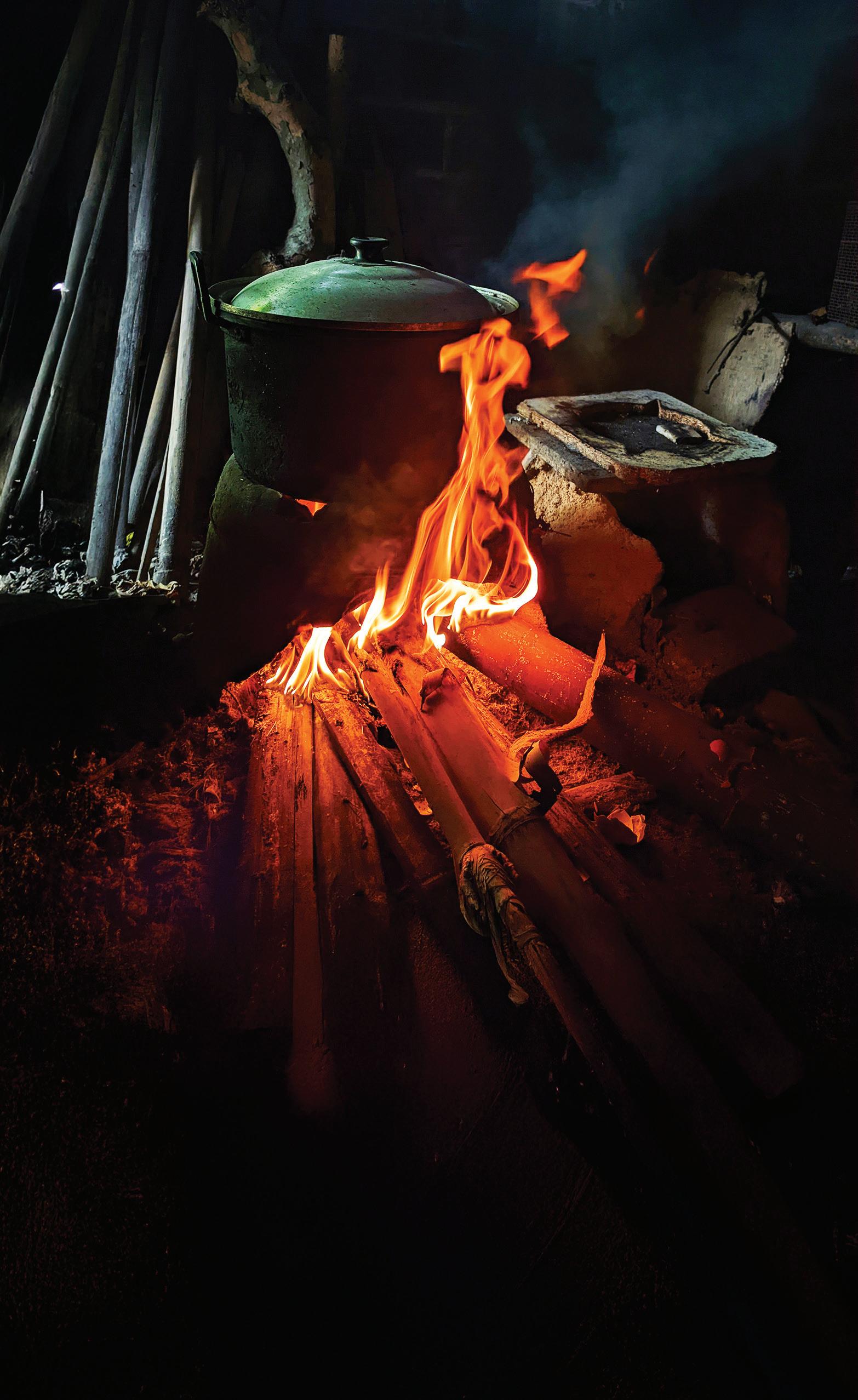 que ocurren en la cocción: la glucosilación, la oxidación de lípidos y, en los dulces, la caramelización. Estas reacciones, esenciales para los cocineros tradicionales, son las que dan a los platillos su aroma, sabor y color característicos. El aroma a leña, tan distintivo de la cocina mexicana, proviene de la pirólisis de la madera (celulosa, hemicelulosa y lignina) que libera más de 300 compuestos, creando esa nota ahumada presente en platillos horneados, tatemados o asados a la leña, así como en bebidas como el mezcal y el chocolate, transportándonos a la cocina de nuestras abuelas y a los fogones de nuestros pueblos.