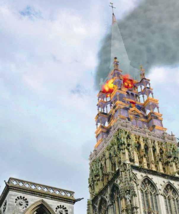 l Autoridades francesas, registraron un incendio en la aguja de la catedral medieval de la ciudad de Ruan , Normandía. El fuego estuvo bajo control unos 90 minutos después. Esta imponente catedral gótica es muy conocida por una serie de pinturas del impresionista Claude Monet. AP