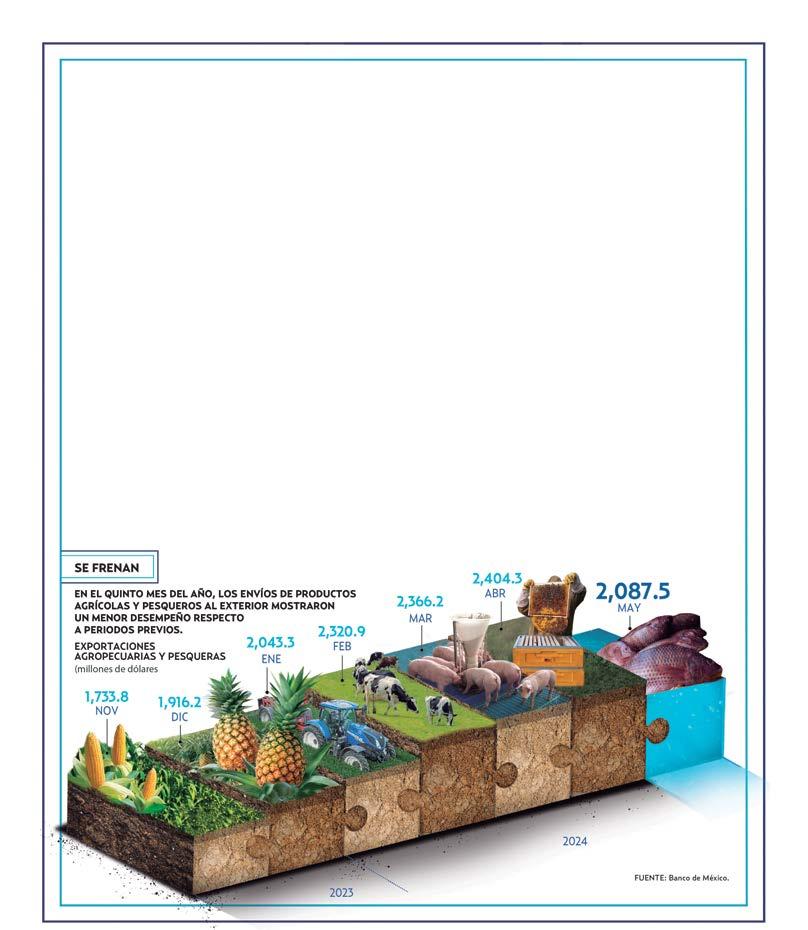 n mayo de 2024, las exportaciones de productos agropecuarias y pesqueras se desaceleraron, al totalizar dos mil 87.5 millones de dólares, su nivel más bajo desde enero y luego de su cifra récord observada en abril previo, de acuerdo con cifras del Banco de México. Esta cifra, significó una disminución de 0.6 por ciento en las ventas de productos agropecuarios y pequeros respecto a mayo del año pasado, mientas que comparado con el mes inmediato anterior se observó una caída de 13.2 por ciento nominal. En los últimos meses el sector agropecuario ha sido afectado por las altas temperaturas que han ocasionado sequías en todo el país, pero especialmente en 14 estados con alta actividad agrícola.