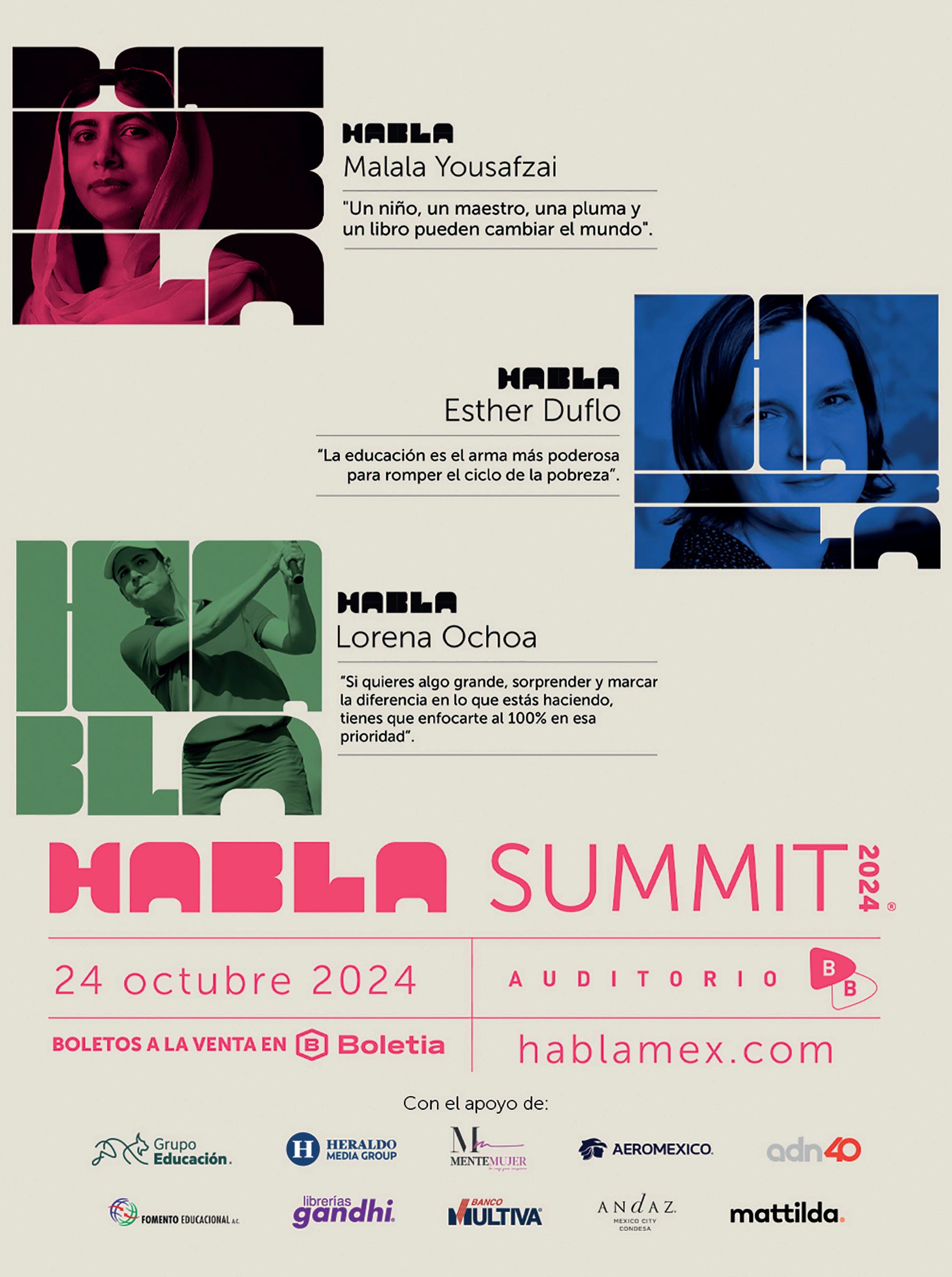 Por segundo año consecutivo, Grupo Educación celebrará HABLA, la plataforma de eventos, alianzas y contenido más importante de México, que tiene como objetivo posicionar la educación como la acción prioritaria para construir un mejor futuro. Para esta segunda edición, el SUMMIT se llevará a cabo el próximo jueves 24 de octubre en el Auditorio BB de la Ciudad de México, con una jornada que contará con 12 ponentes nacionales e internacionales, entre los que se encuentran nombres como Lorena Ochoa, Altagracia Gómez, Esther Duflo, Daniela Labra, Rosaura