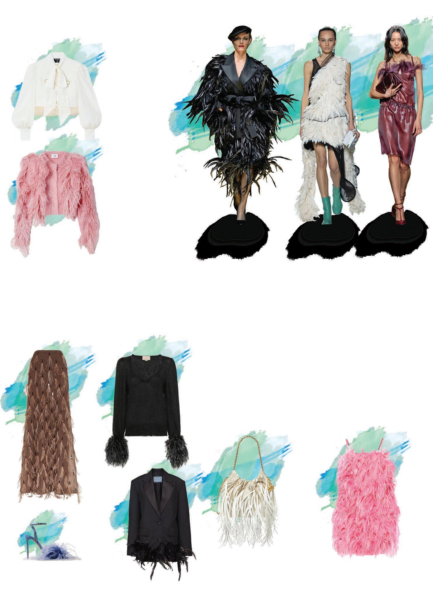 l Las plumas le dan dinamismo a una prenda. Apuesta por llevarlas para algún evento especial de noche o bien puede ser un toque para alguna prenda casual como un suéter o blazer con jeans.