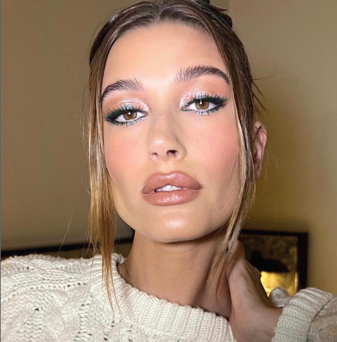 l Ya sea en sombra o en delineado, como éste en Hailey Bieber, el verde destacará tu mirada. Puedes agregar algo de brillo con una sombra en crema para darle un toque más festivo. Los labios nude le dejarán todo el protagonismo a los ojos