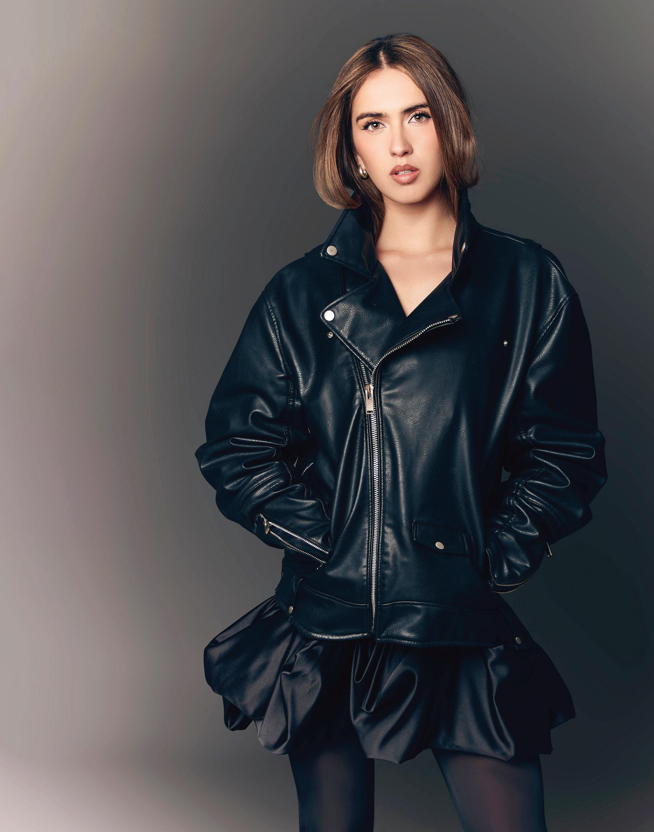 l BÁSICO EN SU ARMARIO: Chamarra de piel y playera negra.