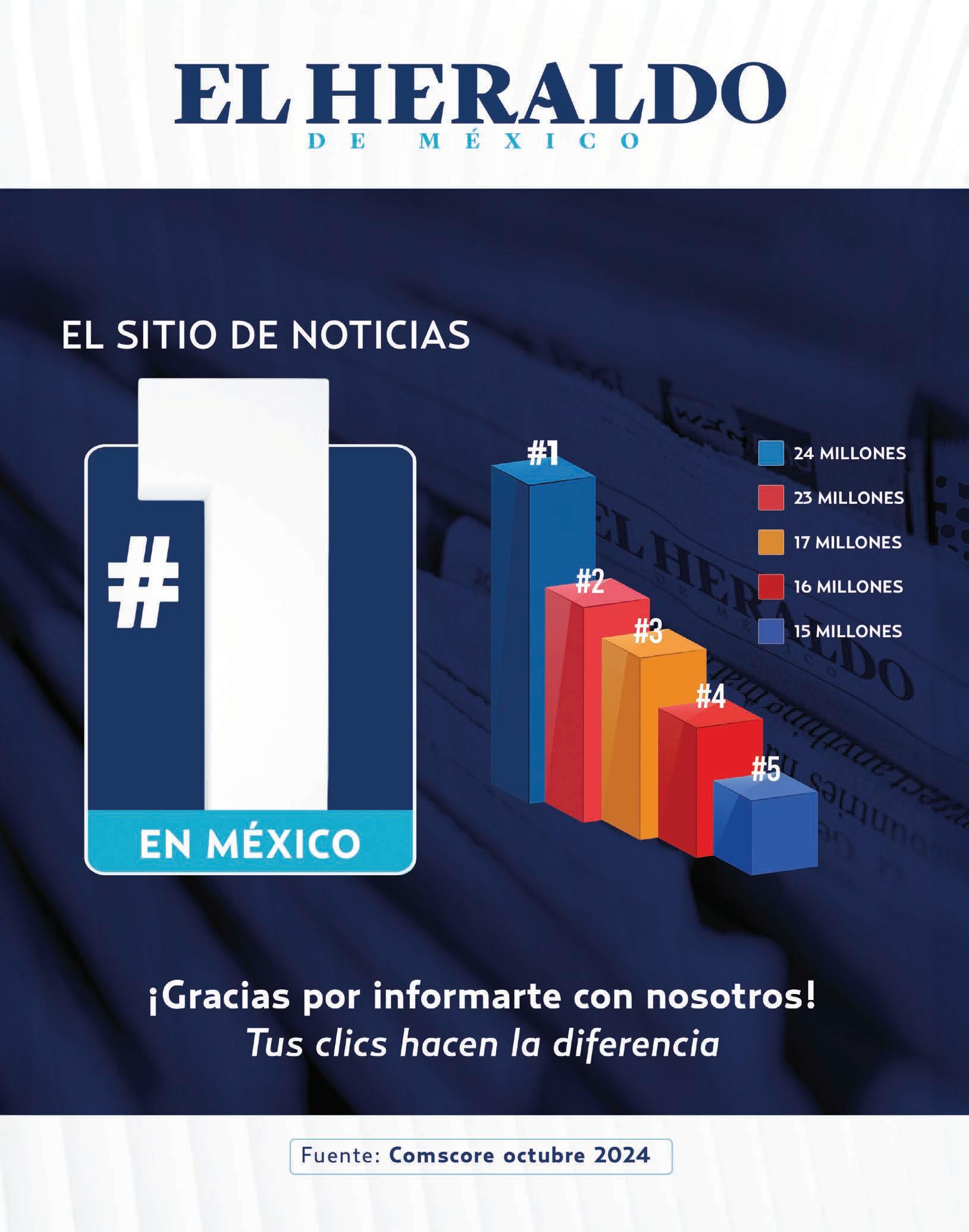 Periódico El Heraldo de México. Editor Responsable: Alfredo González Castro, Número de Certificado de Reserva otorgado por el Instituto Nacional del Derecho de Autor: 04-2009-060419022100-101. Número de Certificado de Licitud de Título y Contenido: 16921. Domicilio de la Publicación: Av. Insurgentes Sur, No. 1271, piso 2, oficina 202, Extremadura Insurgentes, Benito Juárez, C.P. 03740. Impreso en LA CRÓNICA DIARIA, SA DE CV, Avenida Azcapotzalco La Villa 160, Colonia San Marcos, Alcaldía Azcapotzalco, Ciudad de México, CP 02020. Distribuidores: ARREDONDO E HIJOS DISTRIBUIDORA, SA de CV, Iturbide 18 local D, Colonia Centro de la Ciudad de México Área 4, Alcaldía Cuauhtémoc, Ciudad de México, CP 06040. ELIZABETH IVONNE GUTIÉRREZ ORTIZ, Callejón 2o de la Luz 52, Departamento 4, Interior 1, Colonia Anáhuac
