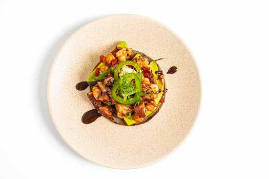 Dentro de la propuesta gastronómica podemos encontrar tostadas, ceviches, antojitos, así como pescas del día y mariscos a las brasas. También cuentan con opciones para quienes prefieran un corte de carne con platillos como el chamorro negro, rib eye de wagyu y taquitos de lengua entomatada. Todo con ingredientes frescos y de alta calidad que enaltecen estos extraordinarios sabores. Asimismo, cuentan con una carta de bebidas curada por la sommelier Arisbeth Araujo. Dentro de su oferta de vinos encontramos etiquetas de México, España, Francia e Italia con variedad de tintos, blancos y espumosos. Un detalle especial que no puedes dejar de probar en tu siguiente visita es el mezcal de la casa elaborado en colaboración con Real Minero, este destilado es de barril de capón de 15 años con notas ahumadas y sutiles.