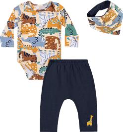 Kit com Body em Cotton Leve e Calça e Babador em Cotton Leve Estampado