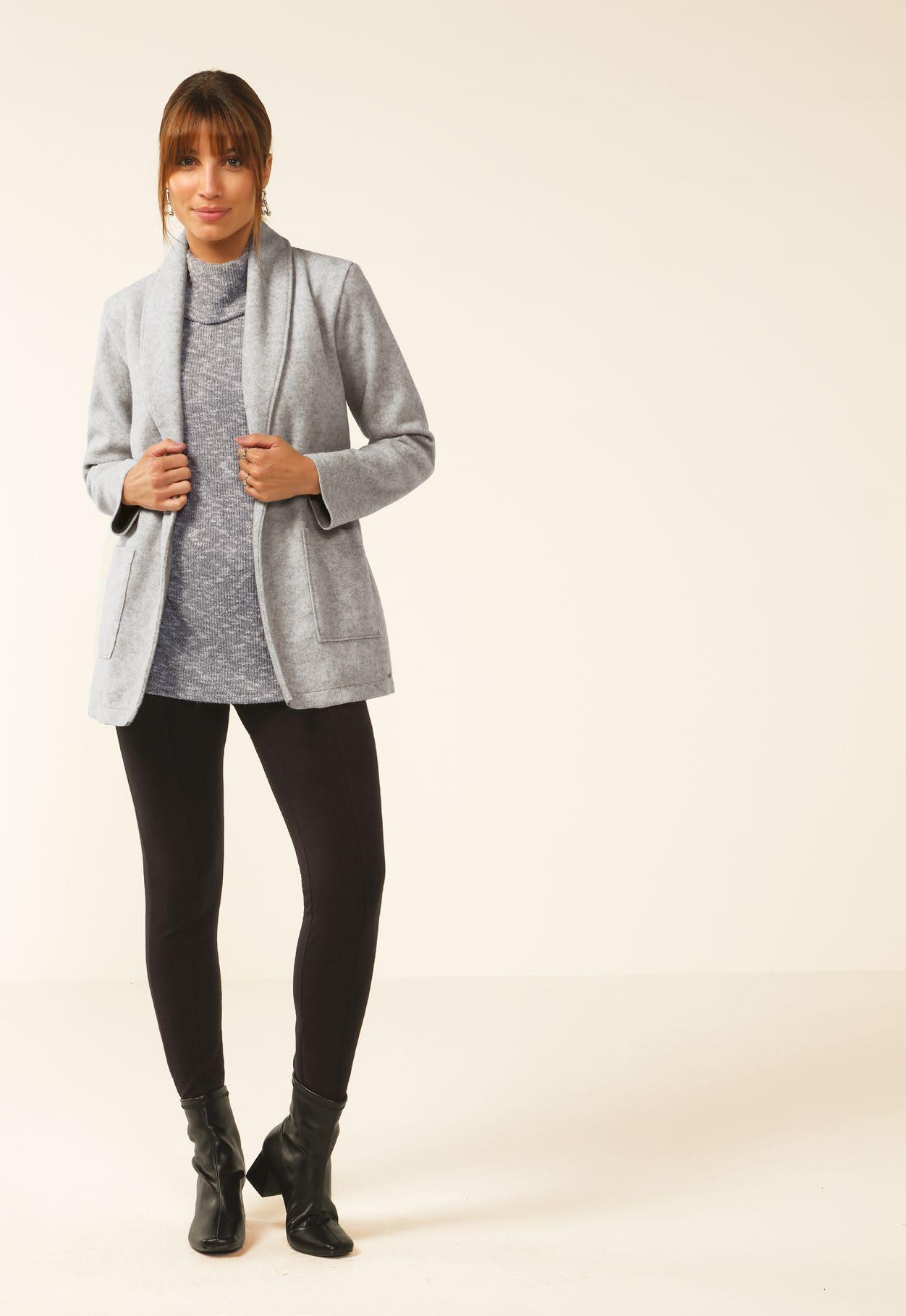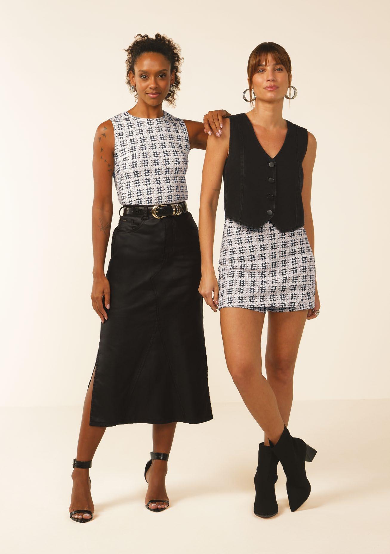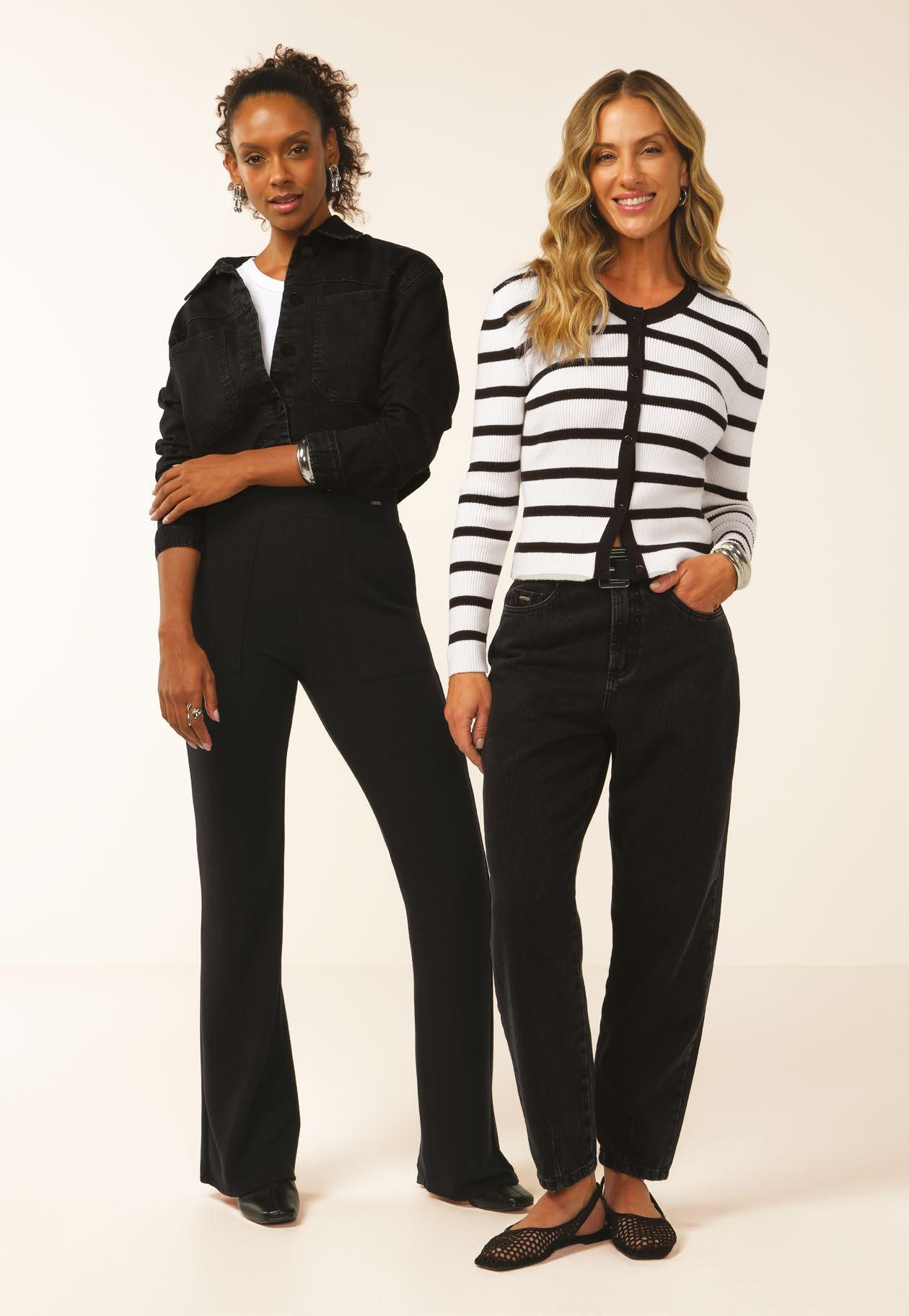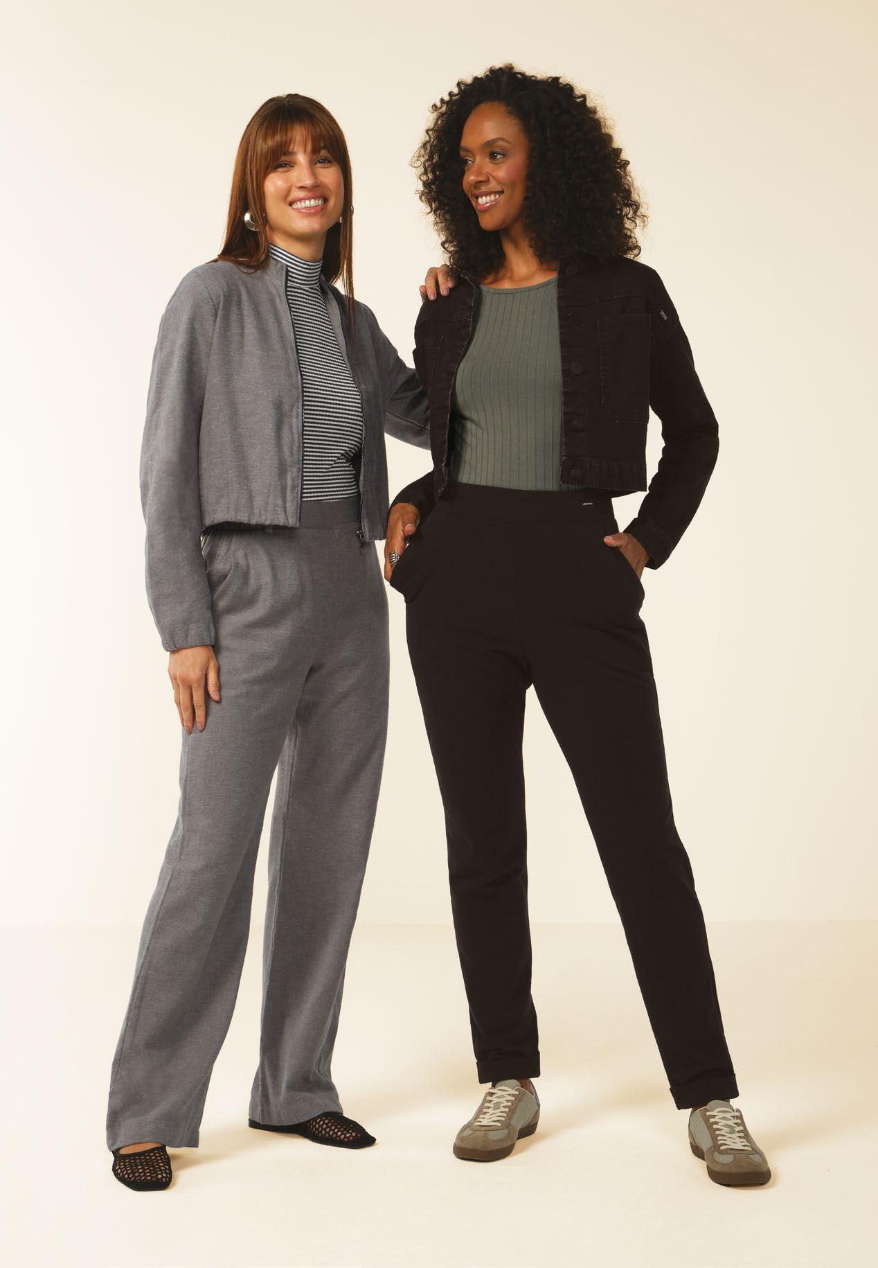 As retilíneas aparecem em golas, punhos e barra. Com textura marcada e estruturada valorizam o design e acabamentos das peças. Um toque moderno para compor looks exclusivos e diferenciados.