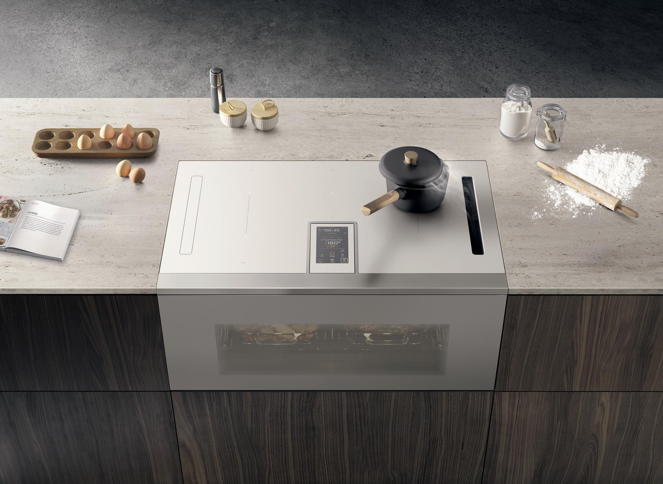 Lhov by Elica is the first and only All-in-One cooking system on the market, integrating hob, oven and aspiration. Awarded the Compasso d’Oro for its design and technological vision, Lhov delivers unprecedented performance: a cavity width 30% larger than standard ovens, traditional and steam automated cooking functions, and an extraction system that removes vapours and odours not only from the hob, but for the first time also from the oven.