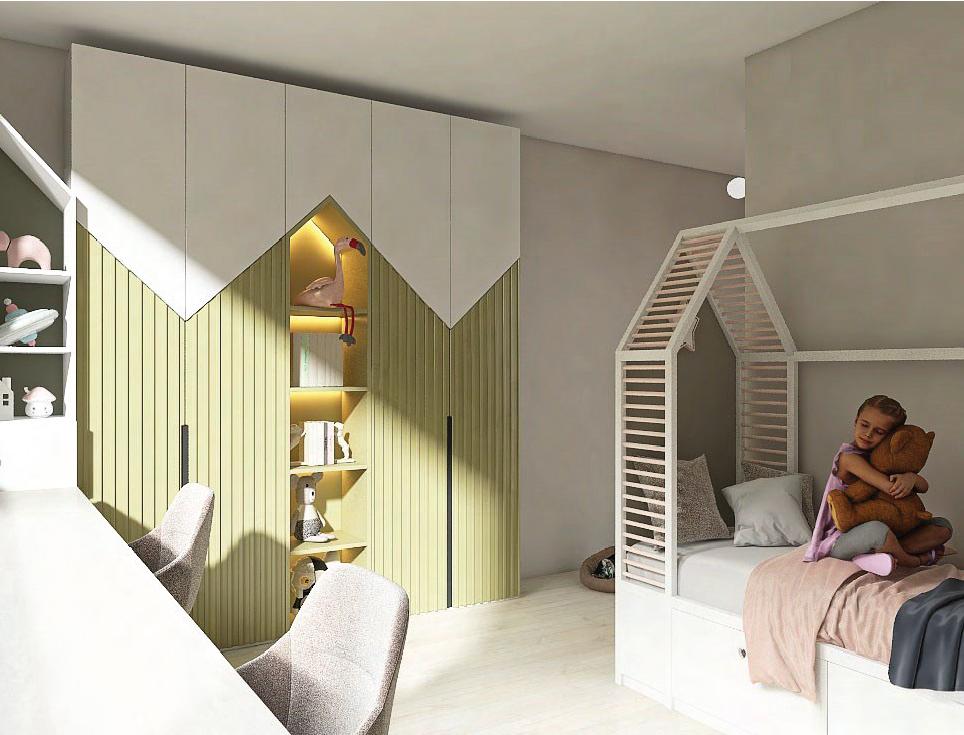This project involves designing a three-story apartment building intended for a charitable organization that supports single mothers. The goal was to create a nurturing and stimulating environment for children during a difficult period in their lives. The interior design balances geometric shapes with organic colors, while the layout prioritizes comfort and functionality for both mothers and children. I incorporated custom features, including a climbing wall, a Swedish gym wall, skylights with geometric patterns, and a glass cube that accompanies the staircase across all three floors.