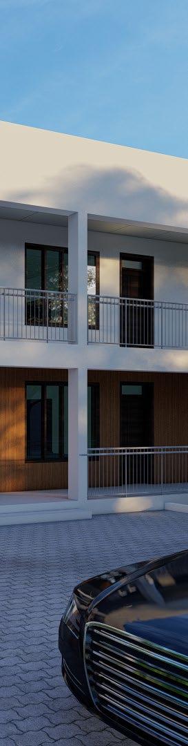 The architectural design combines classical and modern elements to create a balanced and sophisticated aesthetic. Central to the design are the round, tapered columns that evoke a sense of grandeur while offering a refined, streamlined appearance. The building’s facade features plaster siding, providing a smooth, elegant surface that complements the minimalist color palette of grey, cream, and black. A parapet wall is crowned with intricate crow molding, adding a decorative touch that enhances the structure’s classical inspiration. The surrounding landscape is carefully designed with stepping stones, guiding visitors through the outdoor space while seamlessly integrating with the overall architectural composition. The cohesive use of neutral tones and elegant detailing creates a timeless yet modern ambiance.