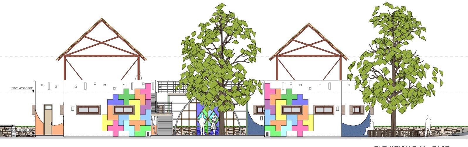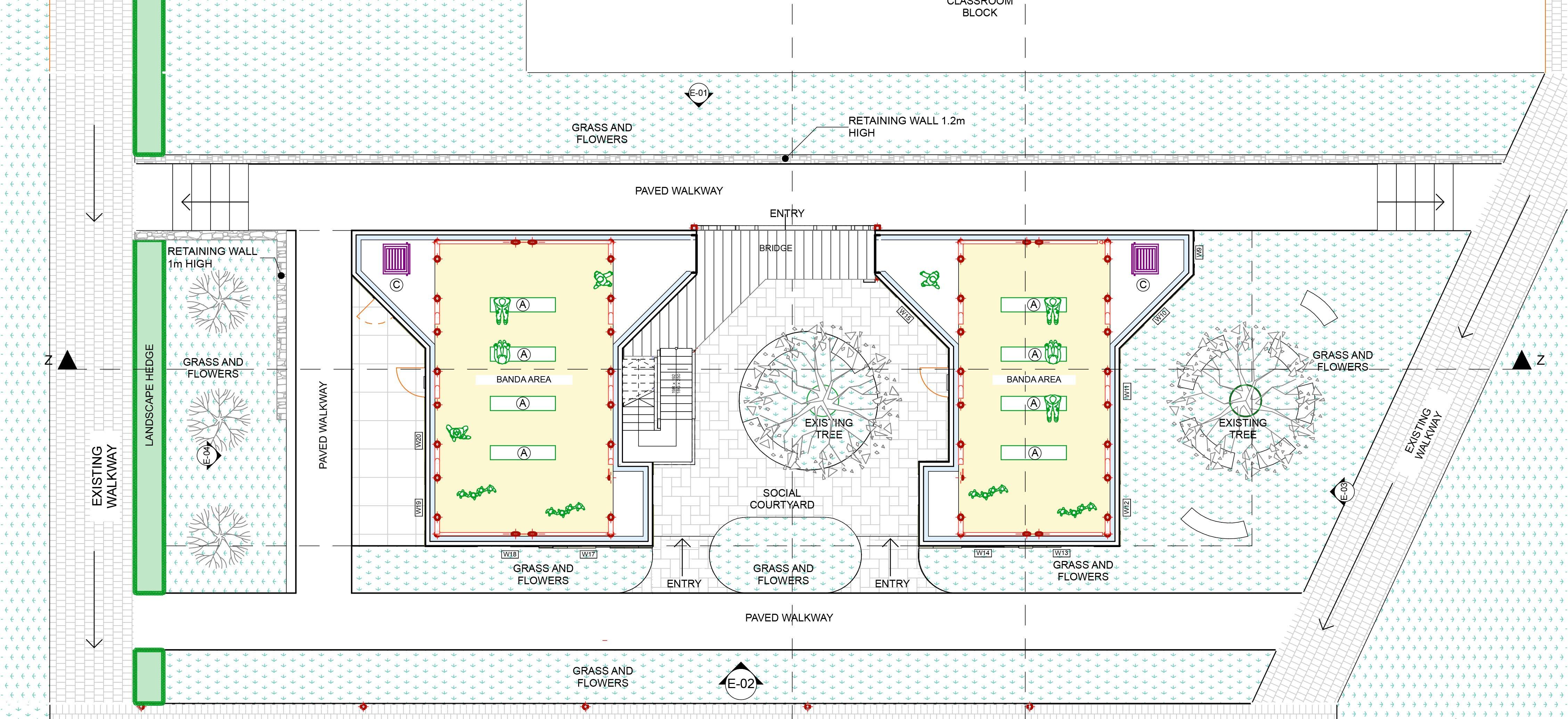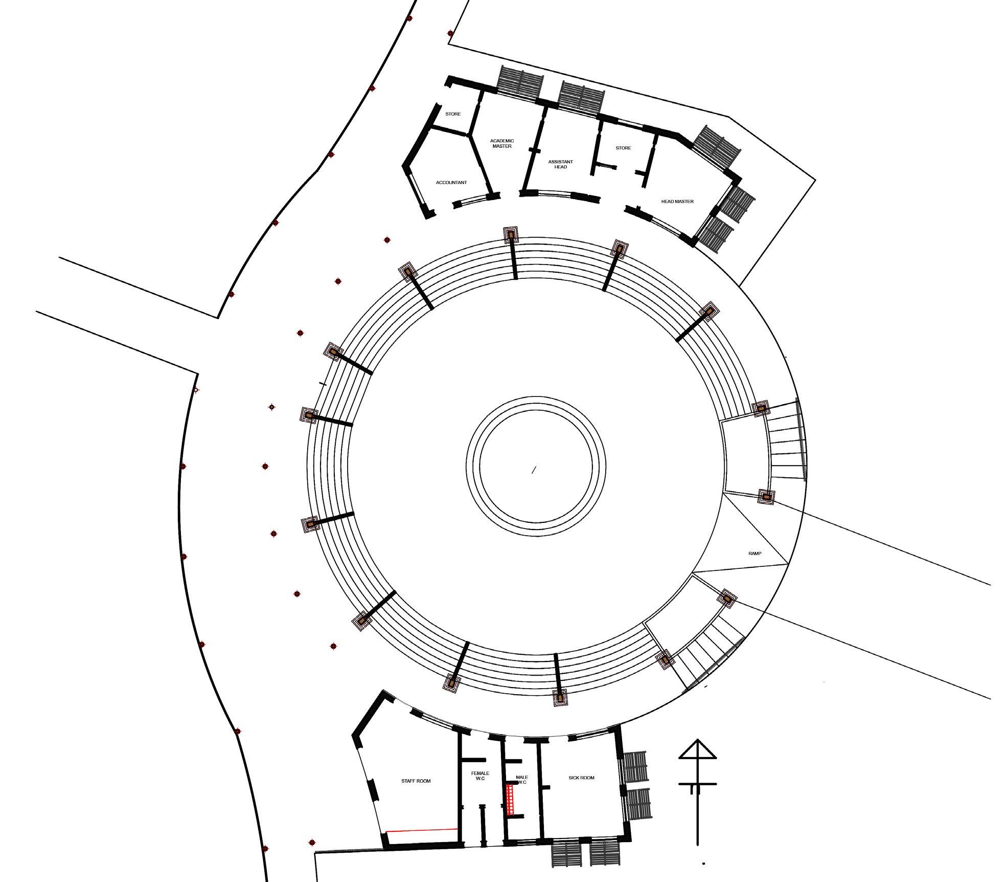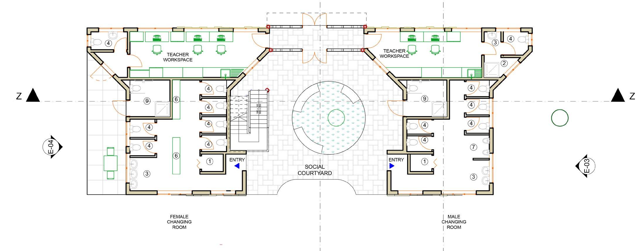 The design includes a middle courtyard and an upper floor designated as relaxation areas for both students and teachers. These spaces provide opportunities for informal gatherings and quiet reflection, promoting a sense of community within the school environment.