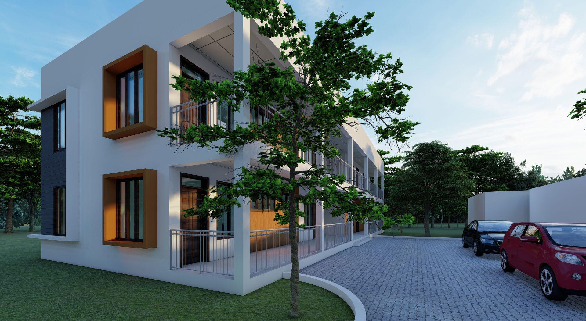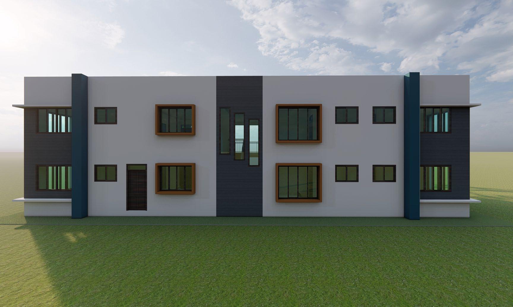 The apartment building complex features a sleek, modern design characterized by its box-like form and flat roof, presenting a minimalist yet bold architectural aesthetic. The two-story structure contains a total of four rooms, offering compact and efficient living spaces within a contemporary framework. The exterior color palette enhances its modern appeal, with dark blue serving as the primary color, lending a striking and sophisticated look to the facade. Off-white is used as a contrasting neutral tone, providing balance and visual harmony, while the use of wood material as an accent wall finish adds warmth and texture to the otherwise streamlined design. Orange-brown concrete window shades not only serve a functional purpose by offering sun protection but also contribute to the building’s unique identity by introducing an earthy, vibrant touch to the exterior. This combination of materials and colors results in a stylish, modern complex that stands out while blending with its surroundings.