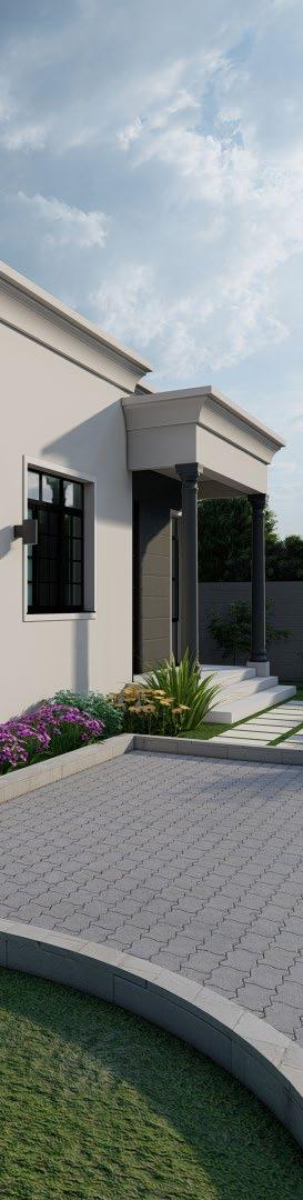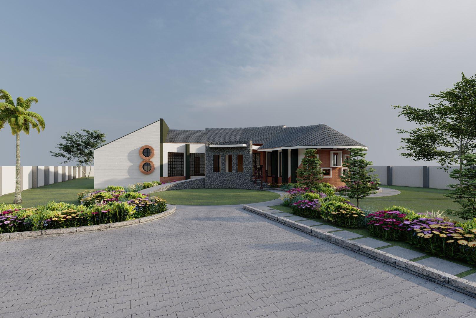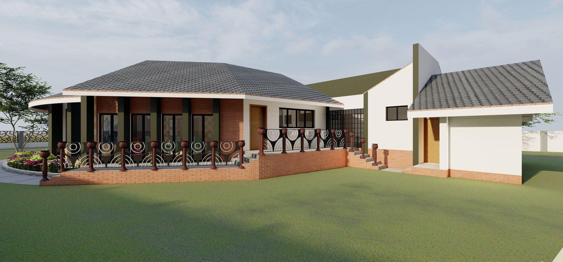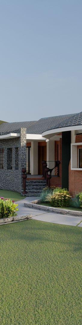 The entrance is designed to be welcoming, with stone cladding on the facade that adds texture and a sense of grounding, symbolizing stability and connection to the land. The roof, covered with grey tiles, recalls the materials often used in African hut construction, providing both function and a subtle nod to tradition. Adding to the cultural richness, terracotta vases are creatively integrated into the balustrade design, their earthy tones reinforcing the natural, grounded aesthetic of the home.