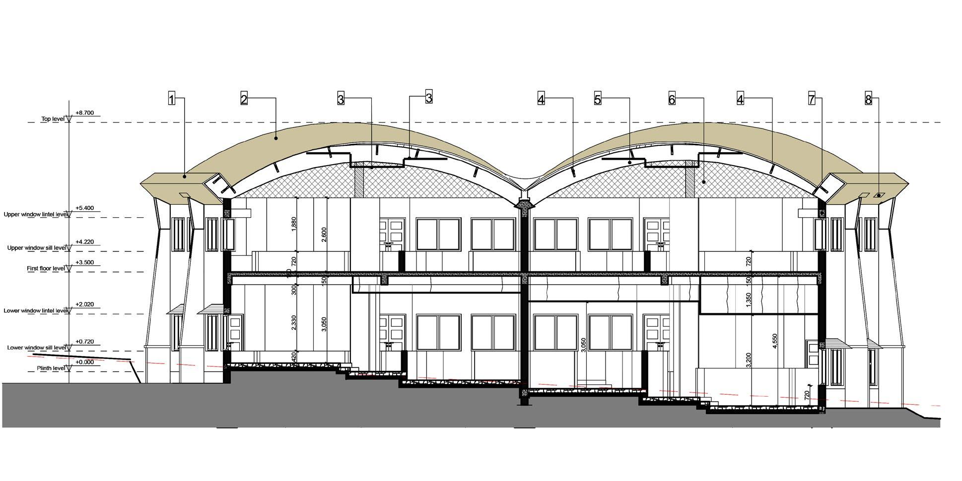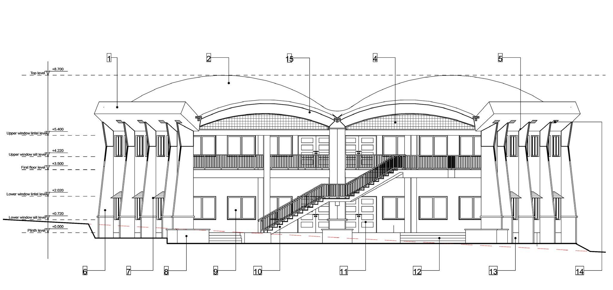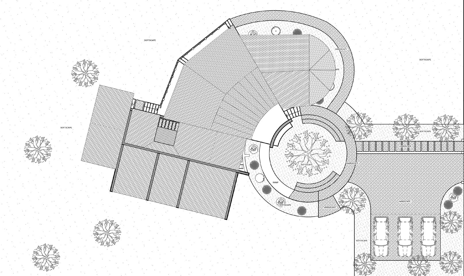 Additionally, the design thoughtfully considers the site’s environmental conditions. The existing vegetation is preserved and seamlessly incorporated into the overall layout, fostering a connection between the building and its natural surroundings while promoting sustainability.
