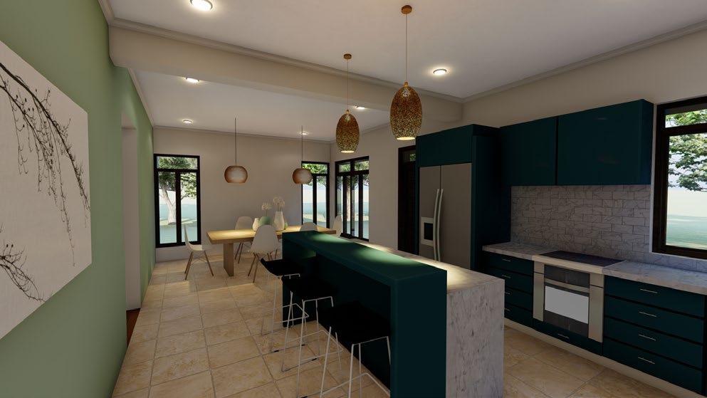 Interior plant decorations are thoughtfully placed throughout the space, bringing nature indoors and enhancing the connection to the natural environment, which is a key element in traditional African homes. Above the dining area, rustic pendant lights add a cozy, textured warmth, evoking the handcrafted elements often found in African design.