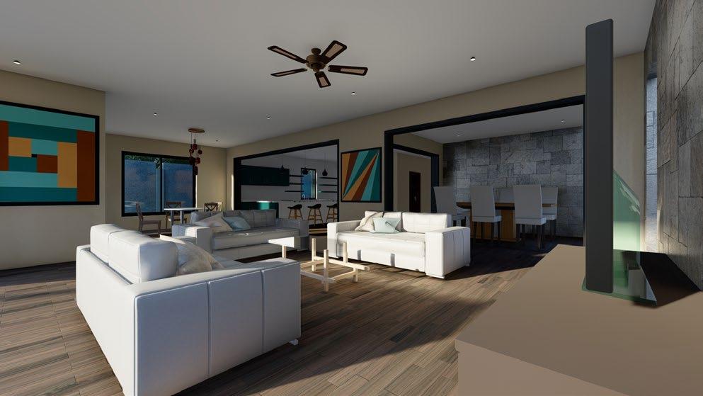 The color palette ties the interior together with soothing cream tones, soft sky blue accents that provide a calming and refreshing atmosphere, and pops of orange, bringing energy and vibrancy to key areas of the home. This thoughtful combination of materials and colors creates an inviting, modern space that honors African design traditions while offering a fresh, contemporary living experience.