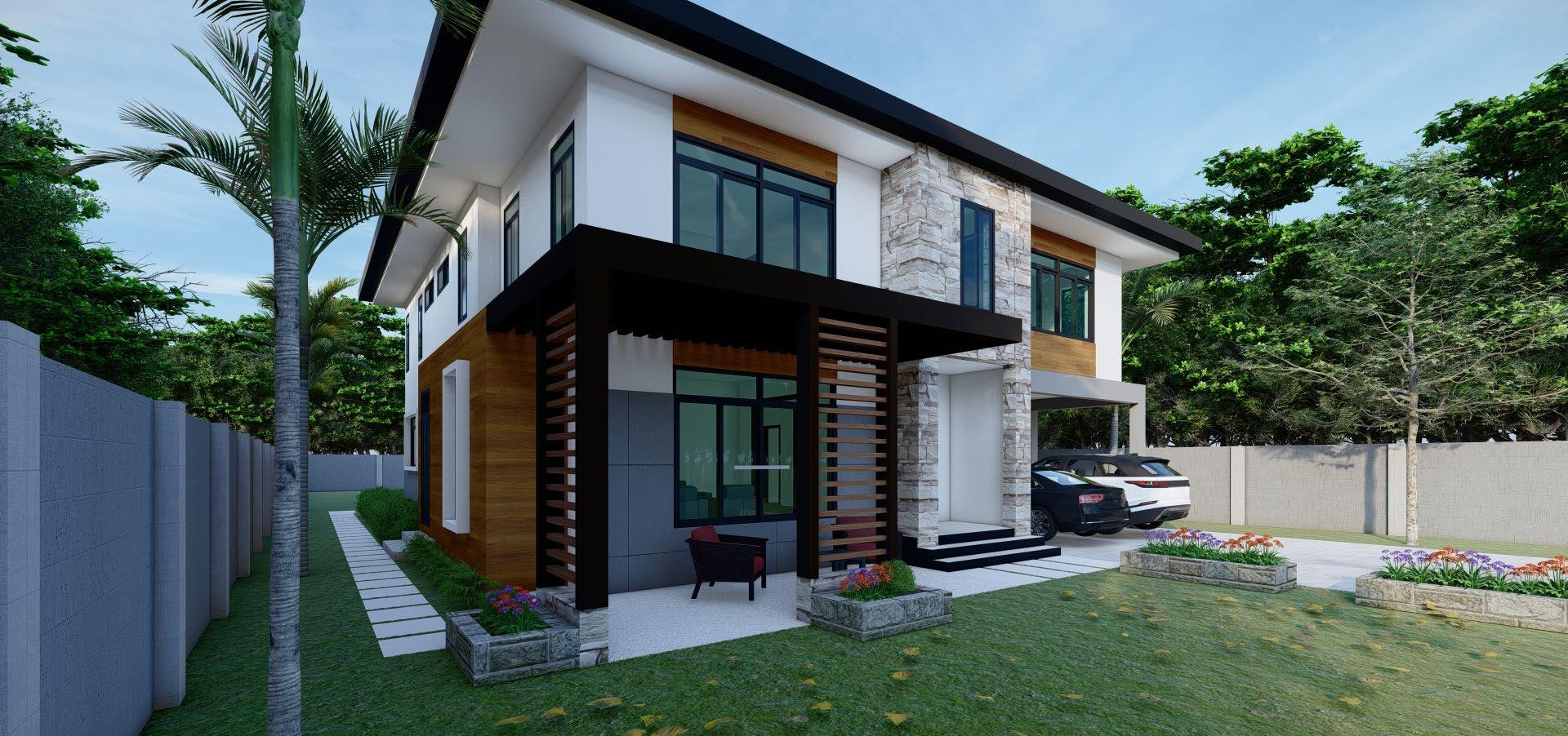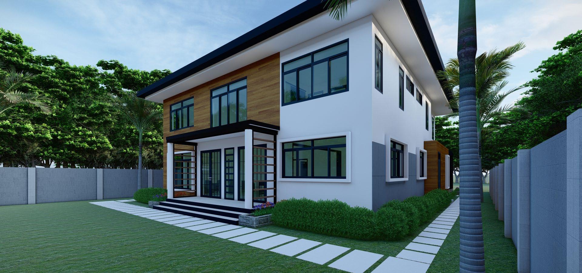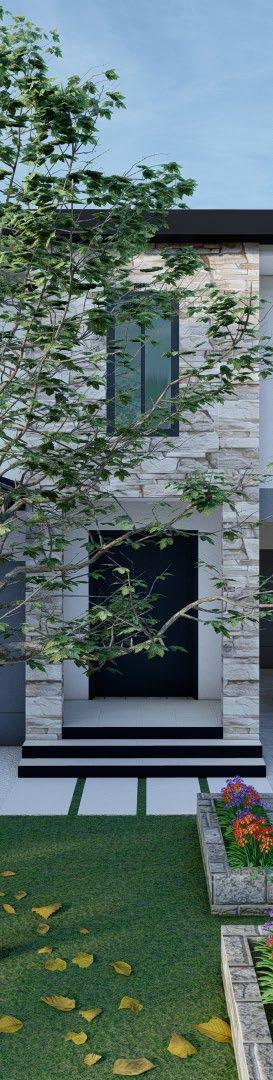 The symmetrical house design exudes a modern classical theme, elegantly blending traditional aesthetics with contemporary materials. The facade showcases a harmonious combination of white stone, which provides a timeless and refined appearance, while grey square blocks add texture and depth, enhancing the exterior’s visual interest. The use of wooden elements framing the bottom and top spaces of the windows introduces a warm, organic touch that contrasts beautifully with the coolness of the stone and grey blocks.