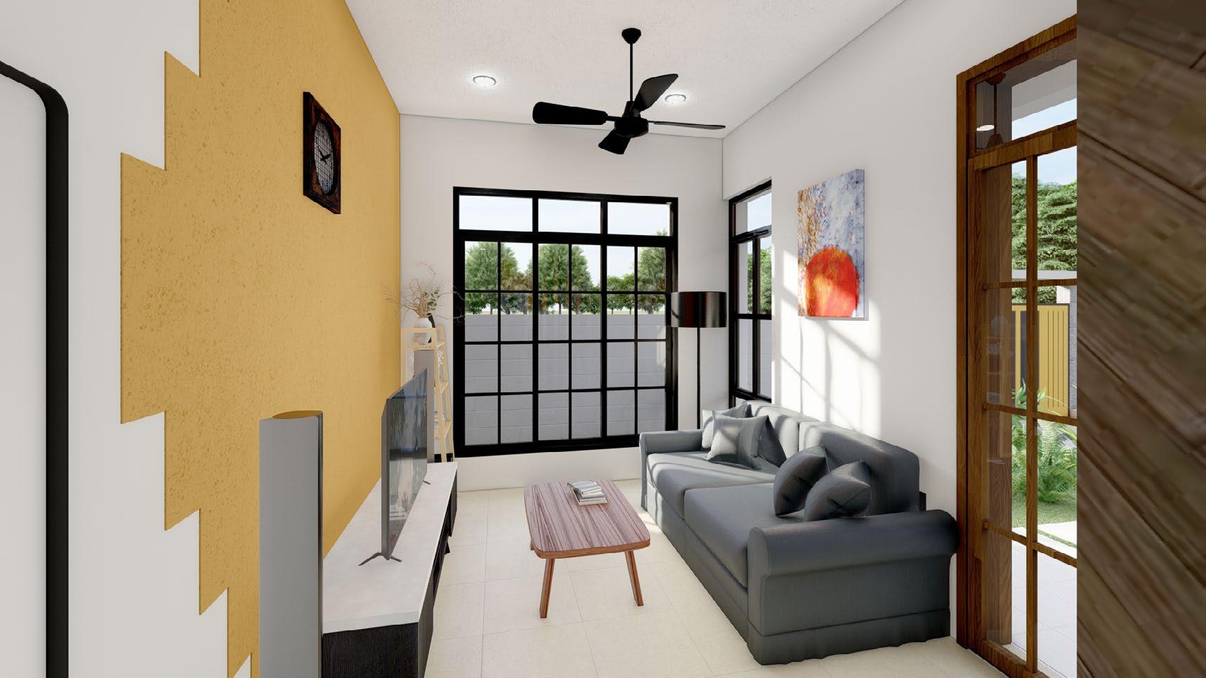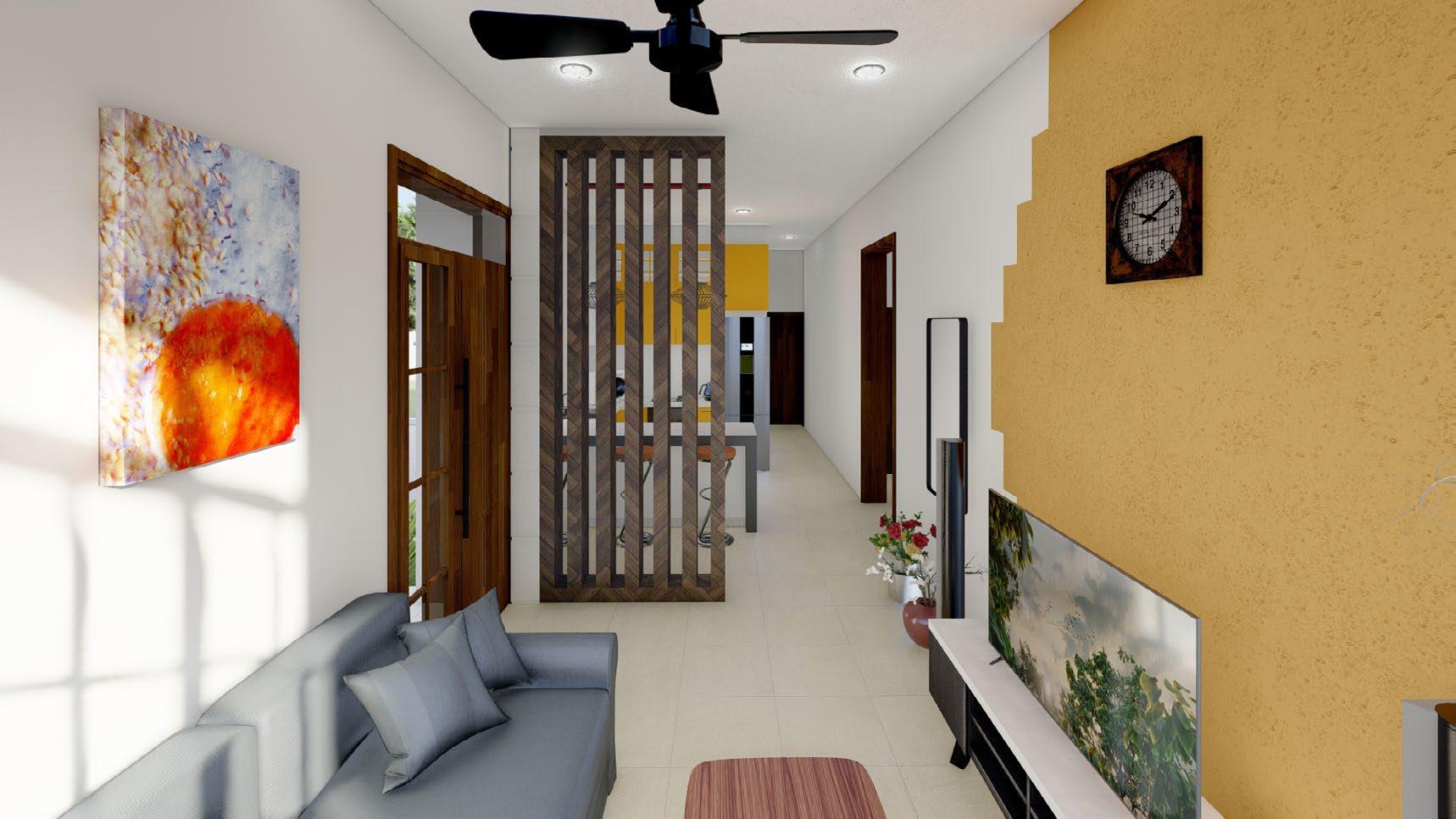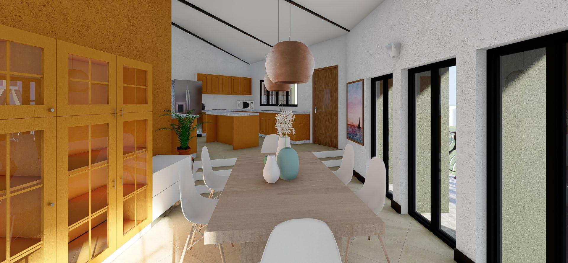 The interior design creates a harmonious blend of warmth and modernity through the use of carefully selected materials and colors. Hardwood doors provide a rich, natural touch that contrasts elegantly with the cream-colored floor tiles, establishing a light and open feel throughout the living spaces. In the bathrooms, grey floor tiles bring a cool, contemporary vibe, while the kitchen showcases a striking marble countertop paired with bold orange-yellow cabinets, adding a lively and energetic focal point. Floor lamps contribute soft, ambient lighting in relaxation areas, while pendant lighting above the dining space creates a stylish and intimate atmosphere. Mirrors are thoughtfully placed in the entrance area, enhancing the sense of space and offering a welcoming touch. The interior color palette ties everything together, with shades of grey, cream, orange-yellow, and blue used strategically to create a balanced, inviting, and visually stimulating environment.