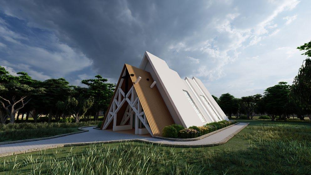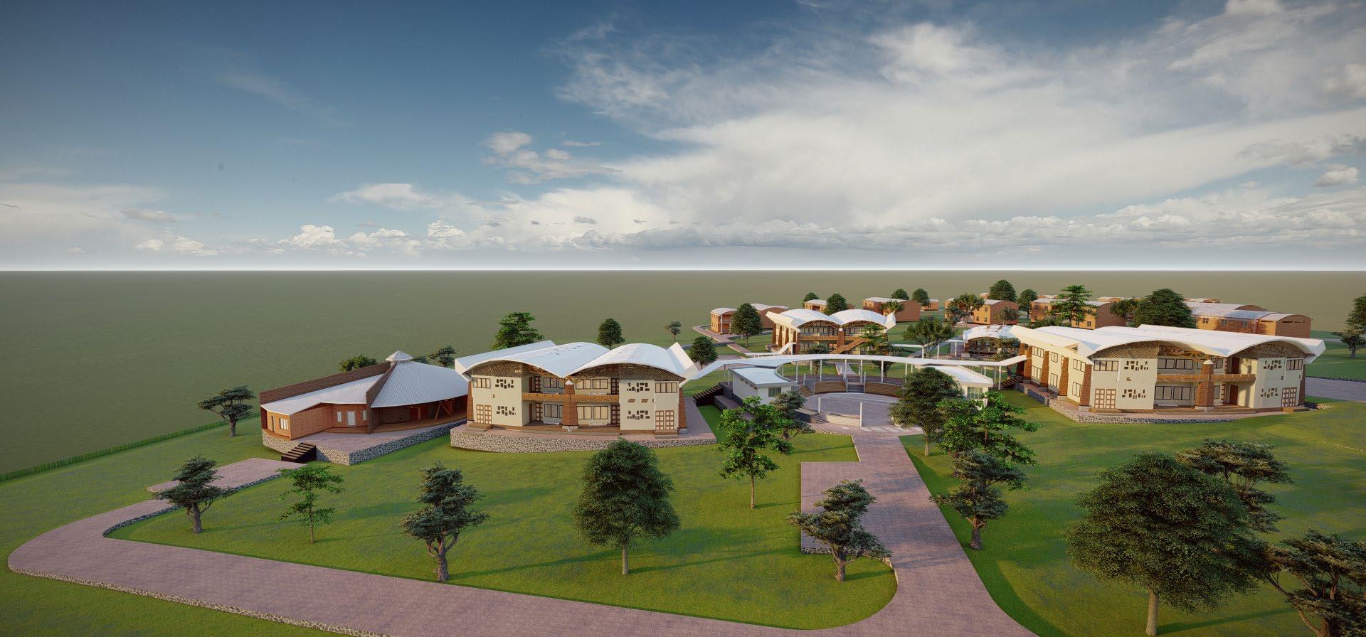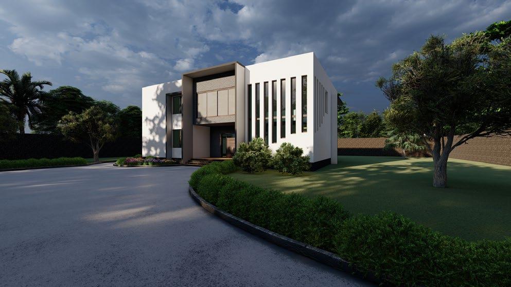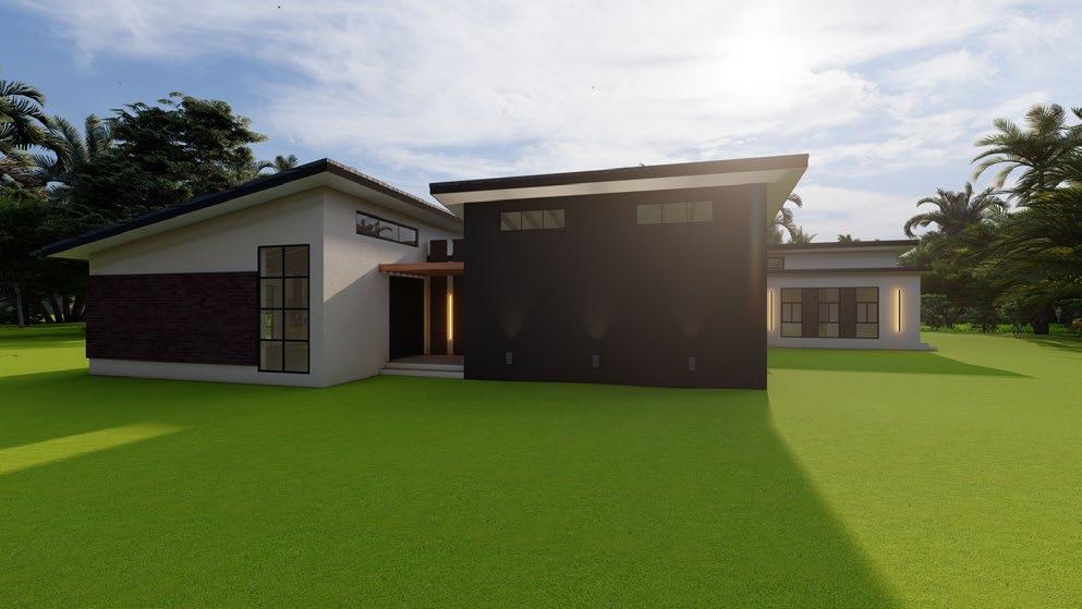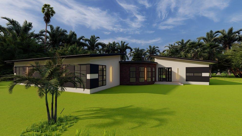 The window elements, framed in black, offer a modern contrast while tying the design together with subtle sophistication. Shades of grey-green are used sparingly to accentuate parts of the building, adding a natural yet modern touch to the overall palette. This combination of shapes, materials, and colors not only reflects African architectural traditions but also elevates them into a contemporary, livable space that celebrates heritage.