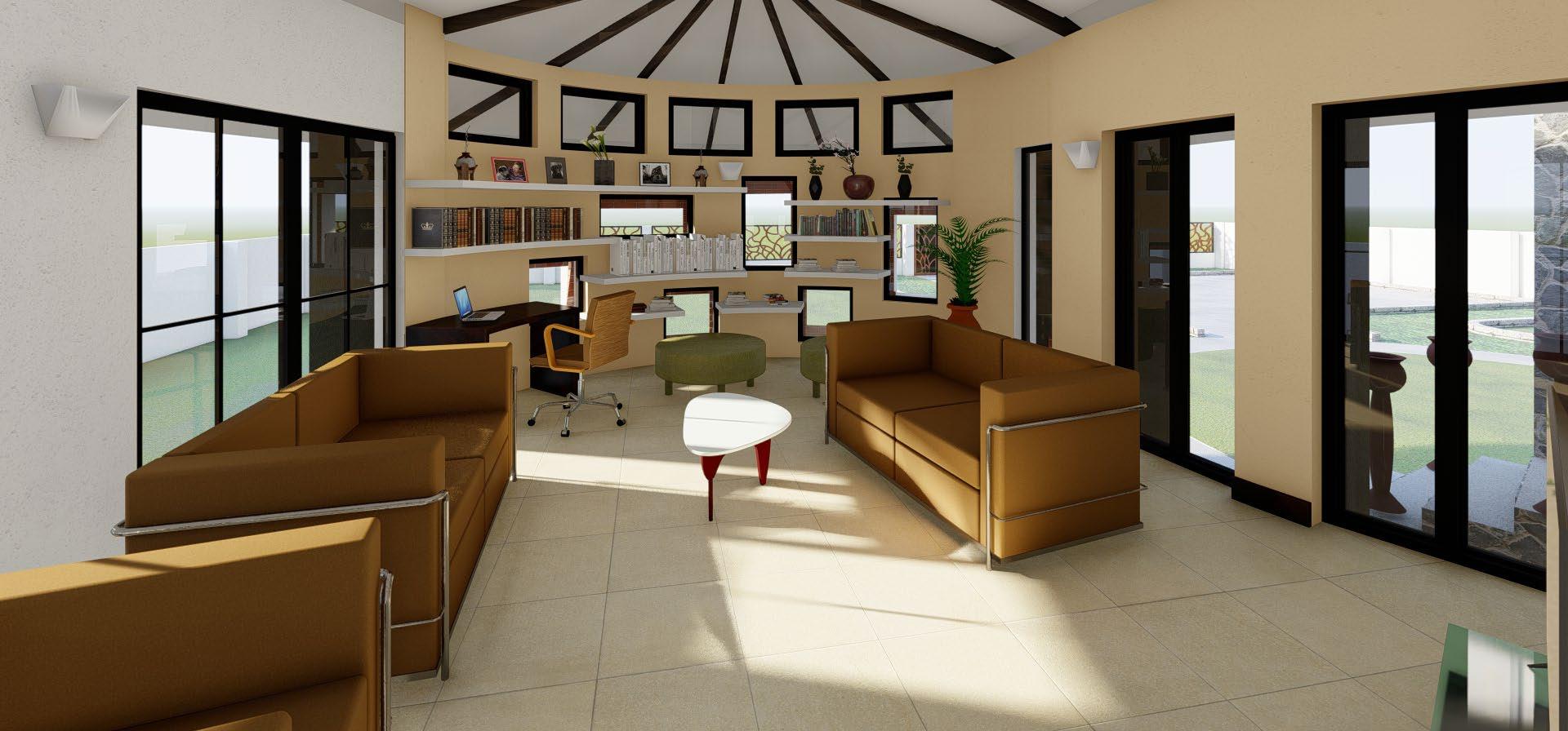 The interior of the house complements its African-inspired exterior by creating a warm and inviting ambiance, blending natural elements with modern touches. Hardwood doors introduce a rich, organic feel, harmonizing with the overall earthy aesthetic. The floors are laid with cream-colored tiles, which brighten the space and provide a neutral base for the interior design. In the bathrooms, grey tiles are used to add a cool, modern contrast, balancing the warmth of the other elements and contributing to the clean, contemporary feel.
