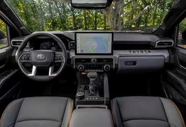 El interior ha sido una grata sorpresa. A pesar del aspecto rudo e intrépido del exterior, la Tacoma Trailhunter está generosamente equipada, con un diseño llamativo y materiales muy adecuados, en los que incluso no abundan los plásticos. El tapizado de cuero azul claro "Mineral SofTe" y los materiales del tablero de instrumentos presentan un aspecto y una sensación agradables.