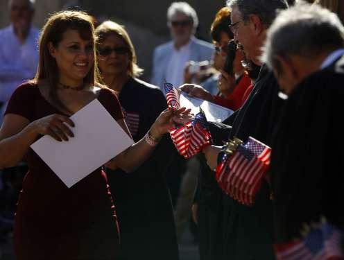 ► Un mujer recoge el certificado de su ciudadanía y la bendera estadounidense. Imagen de archio. EFE/Thais Llorca
