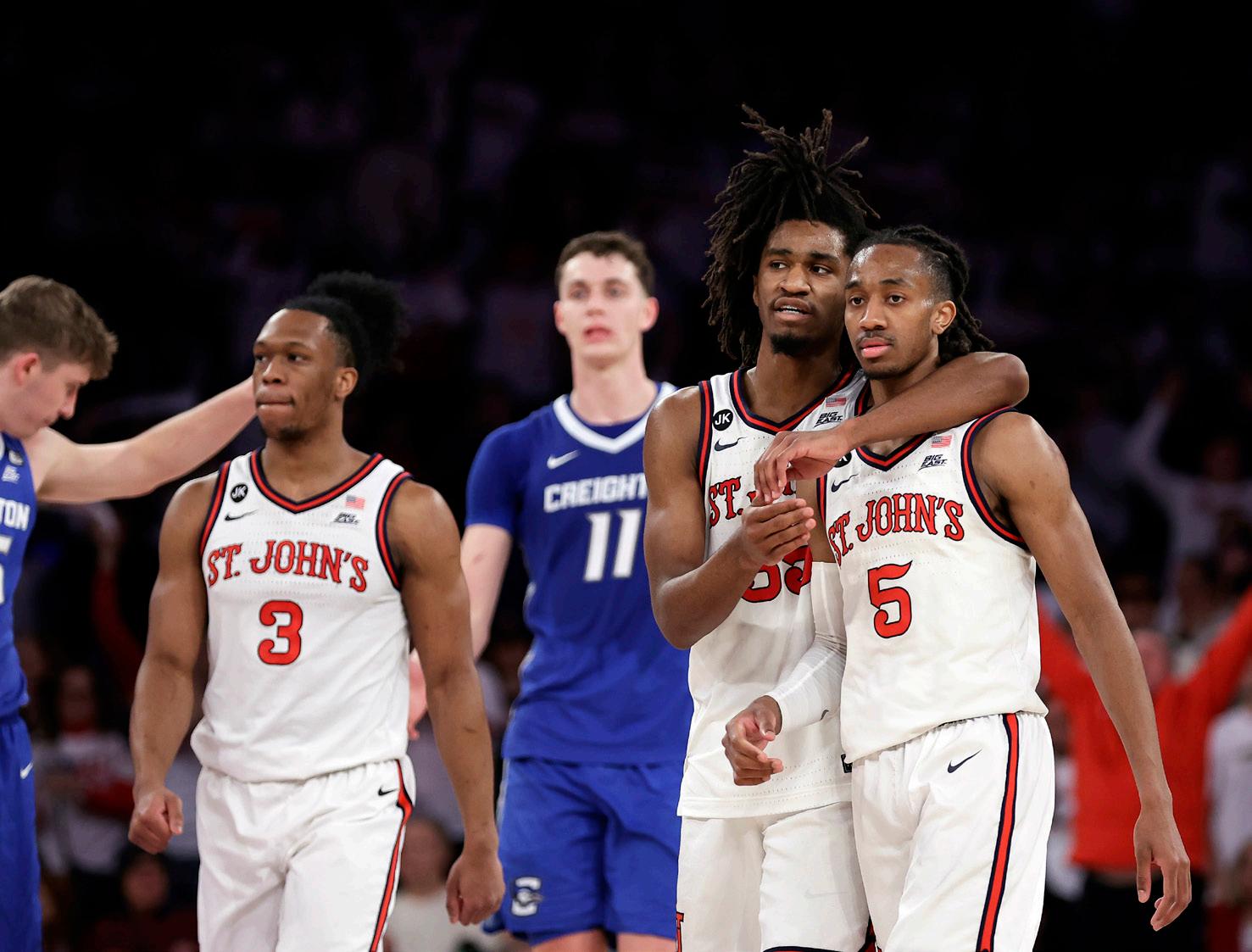 St. John’s guard Daniss Jenkins and forward Glenn Taylor Jr. enjoy the Red Storm’s 80-66 win over Creighton at Madison Square Garden on Sunday. (AP Photo/Adam Hunger)