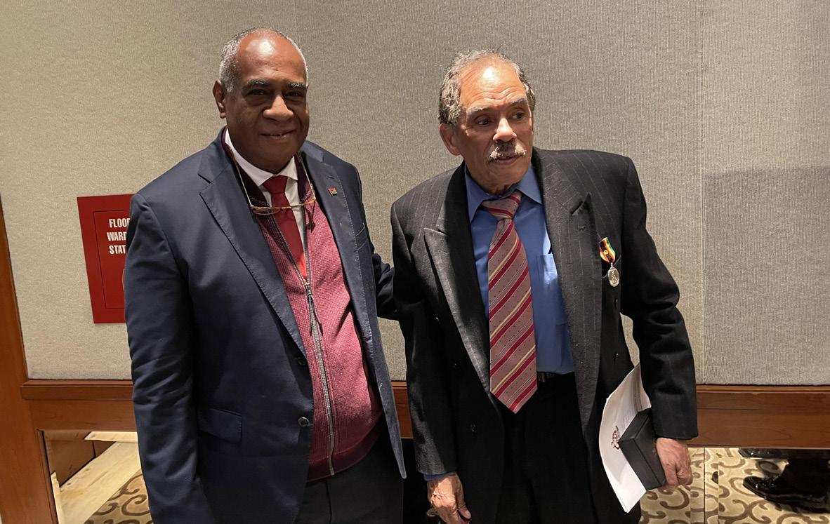 At the evening celebration, Kalsakau saluted Robert Van Lierop, Vanuatu’s ambassador to the UN from 1981 to 1994. “I would like to thank Ambassador Van Lierop for his contribution and service,” Kalsakau said. He noted that Van Lierop was instrumental in bringing the conditions of the small island na-