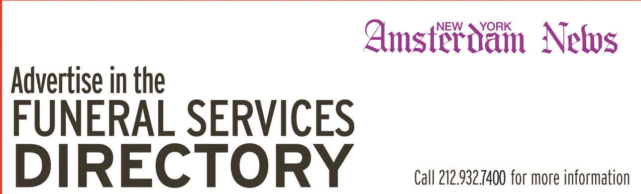 The Amsterdam News assumes no responsibility for the return of unsolicited manuscripts or photographs. Photographs and manuscripts become the property of The Amsterdam News. Published weekly. Periodicals Class postage paid at New York, N.Y. POSTMASTER: Send address corrections to NY Amsterdam News, 2340 Frederick Douglass Blvd., New York, NY 10027.