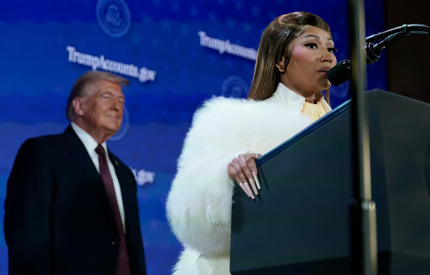 President Trump listens as Nicki Minaj speaks during launch of program known as Trump Accounts. (Jose Luis Magana/AP)
