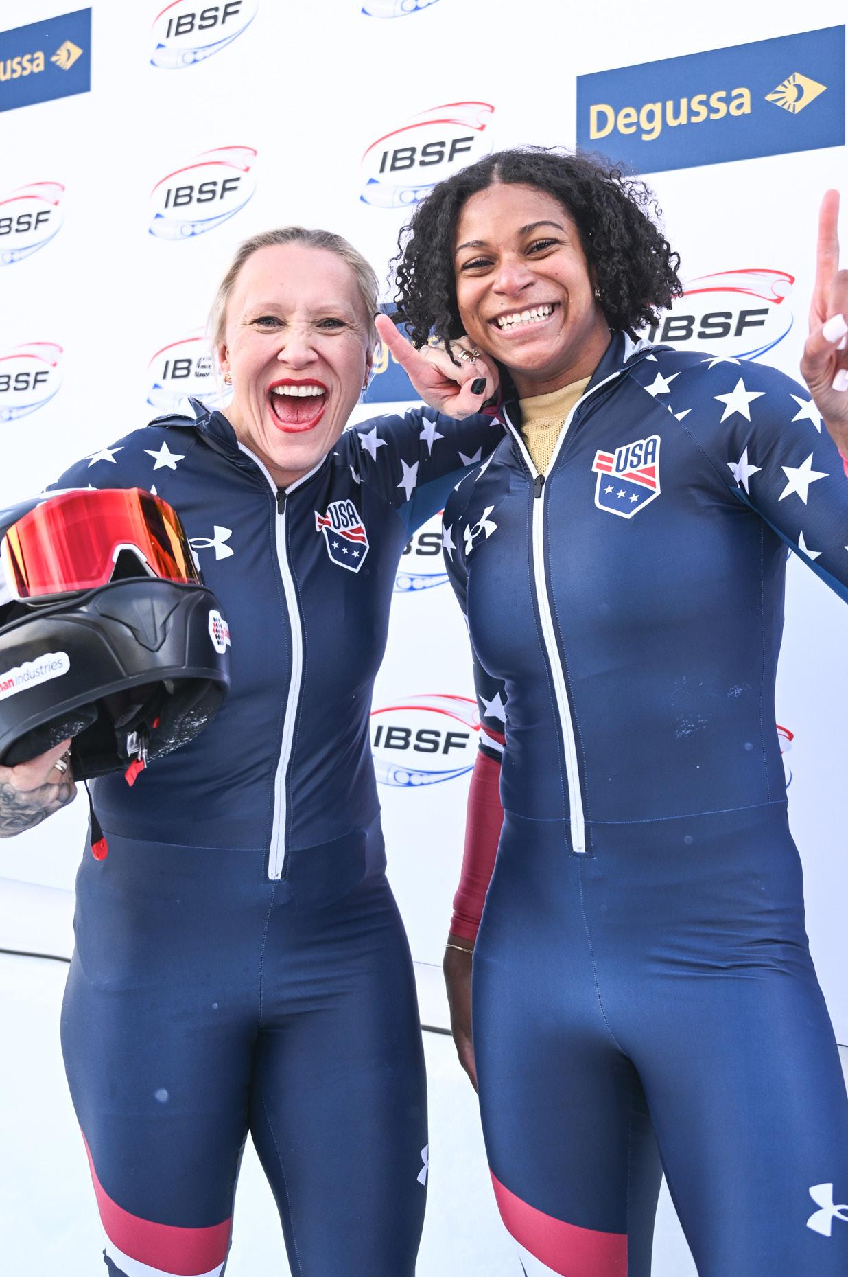 Brakewoman Jasmine Jones (r) and bobsled pilot Kaillie Armbruster Humphriesstrike a happy pose after capturing gold at the St. Moritz, Switzerland World Cup event. (Viesturs Lacis/IBSF photo)