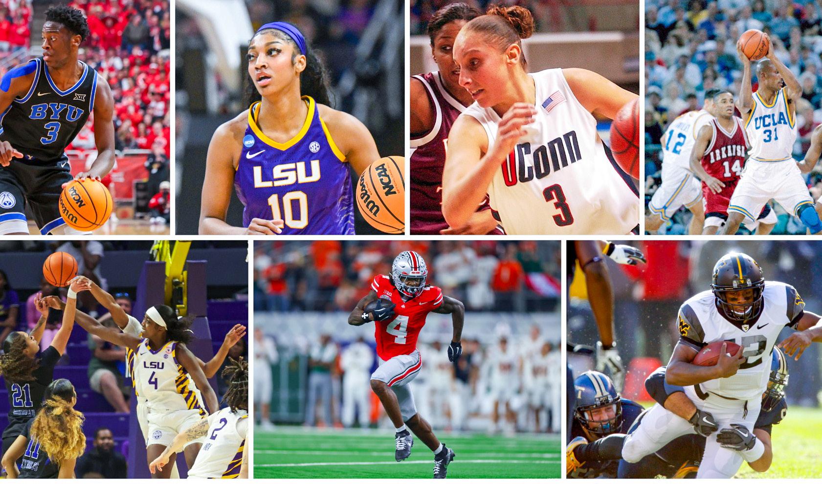 (Top row l-r) AJ Dybantsa, Angel Reese, Diana Taurasi, Ed O’Bannon. (Bottom row l-r) Flau Jae Johnson, Jeremiah Smith, and Shawne Alston. (AP photos)