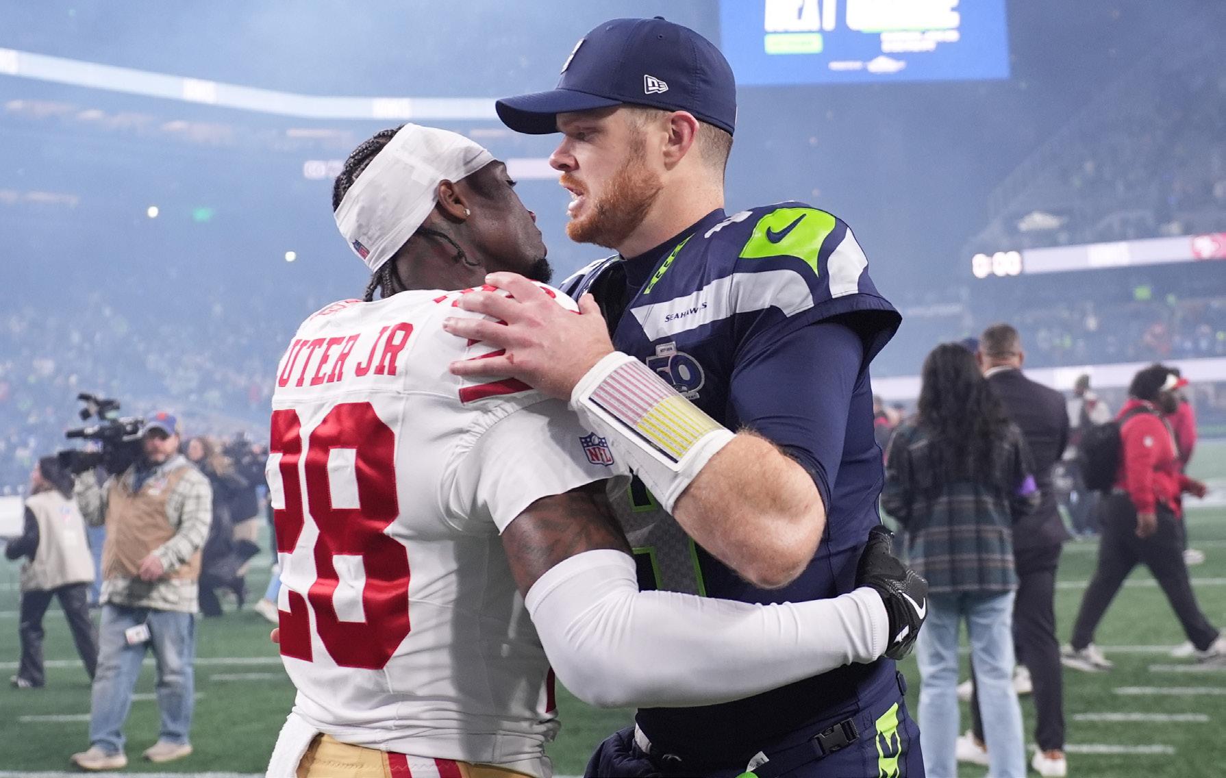 Seattle Seahawks quarterback Sam Darnold (right) embraces San Francisco 49ers cornerback Darrel Luter Jr. after the Seahawks 41-6 win on Saturday in the NFL playoffs. (AP Photo / Lindsey Wasson)