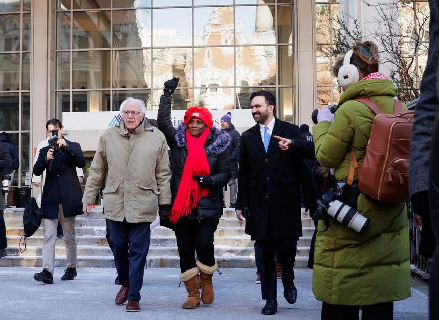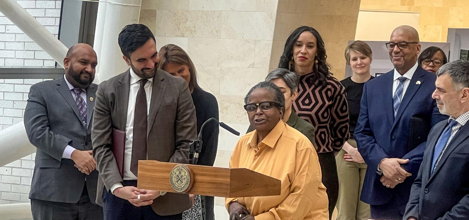 Supportive housing advocate Helen Taylor (center) joins Mayor Zohran Mamdani at Jacobi Medical Center. (Tandy Lau photo)