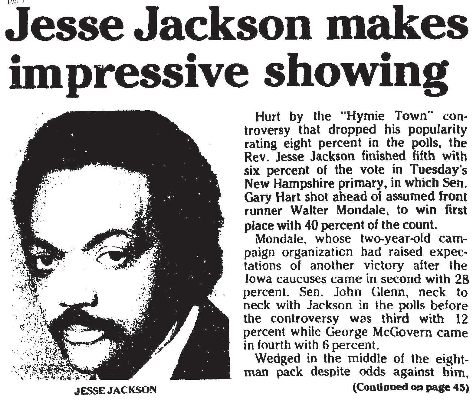 He finished in third place for the Democratic nomination, trailing former Vice President Walter Mondale and Sen. Gary Hart. Four years later, he was once again on the presidential campaign trail, and though he did very well in the race, winning several states and a number of delegates, he finished behind the runner-up, Gov. Michael Dukakis of Massachusetts.