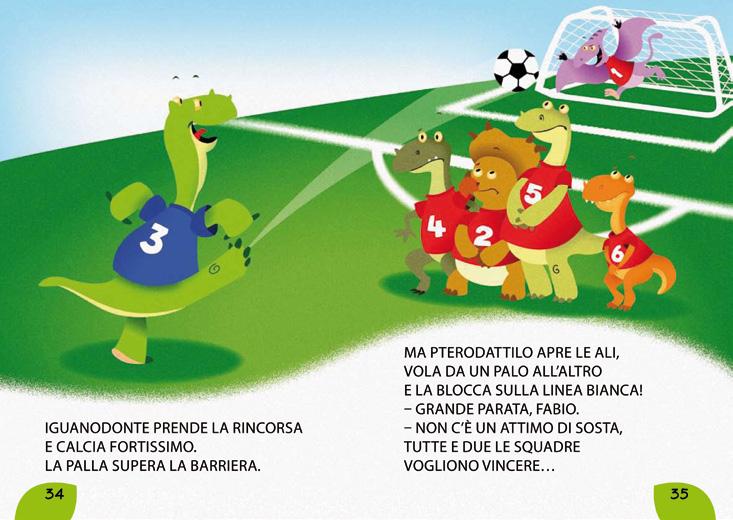 Il libro racconta… la telecronaca di un’avvincente partita di calcio, giocata quasi come un videogioco tra due squadre fortissime e con un arbitro molto severo! Ma c’è un piccolo particolare: i giocatori sono dinosauri! Da una parte i Ferox, dall’altra i Predator. Un incontro appassionante, ricco di sorprese e colpi di scena.