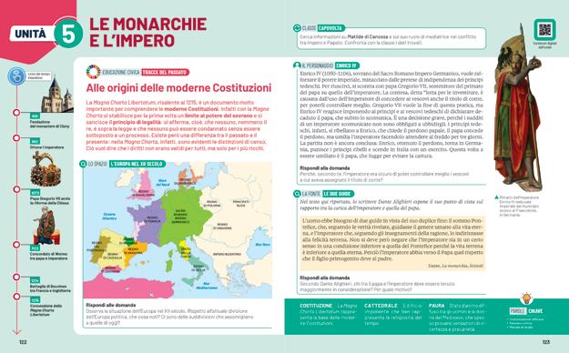 Ogni unità si apre con una linea del tempo, che offre una prima collocazione degli eventi. Seguono carte storiche, per capire dove accadono i fatti; personaggi simbolo, che presentano il periodo; e fonti originali che permettono di avvicinarsi alla storia in modo diretto.