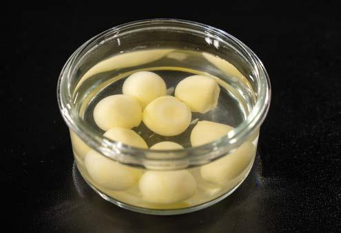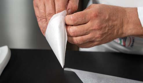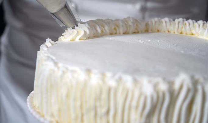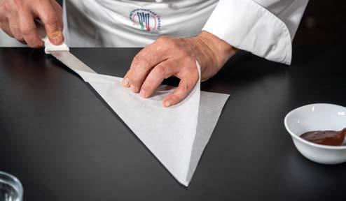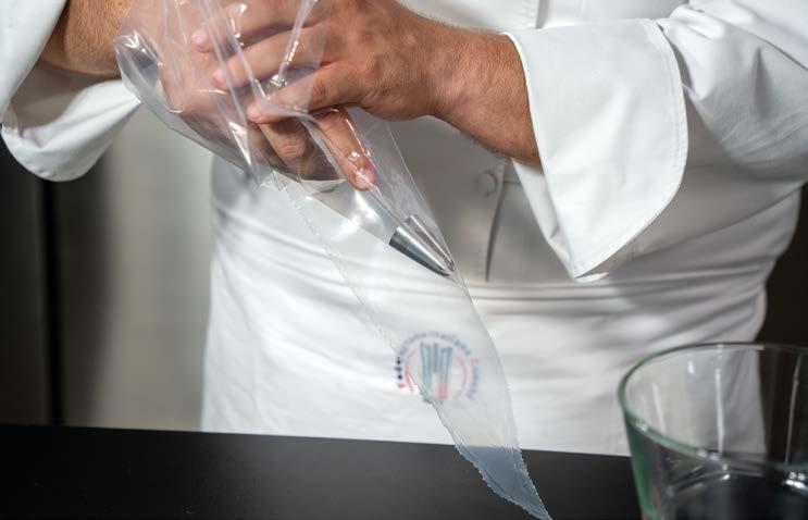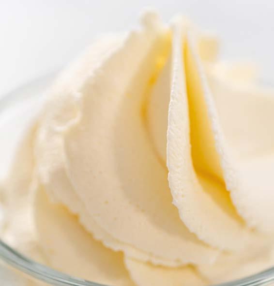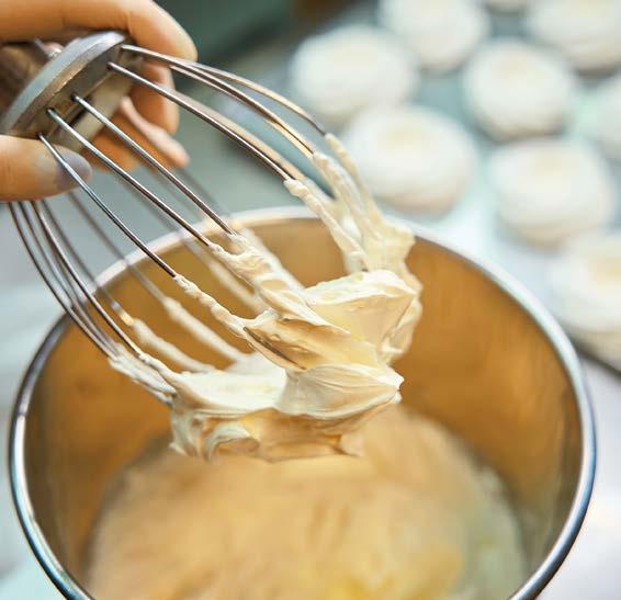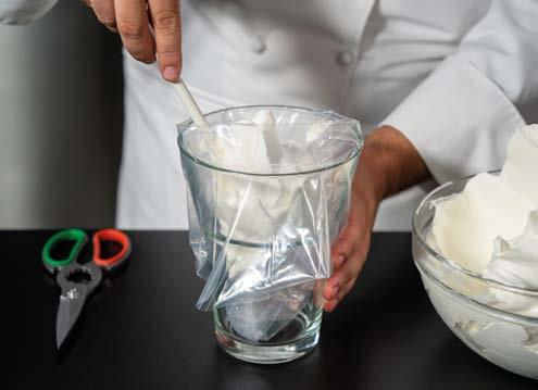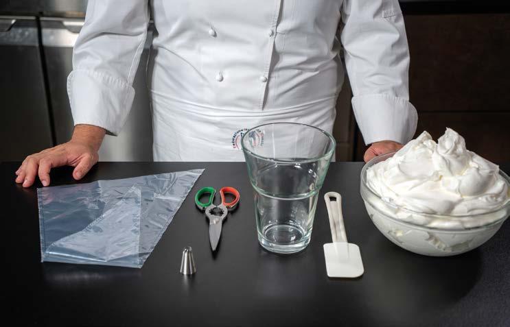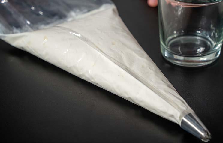 4 Conservare a +4 °C. Inserire la rimanente panna in un sac à poche con la bocchetta piccola liscia e farcire i bignè.