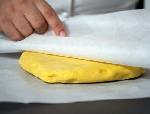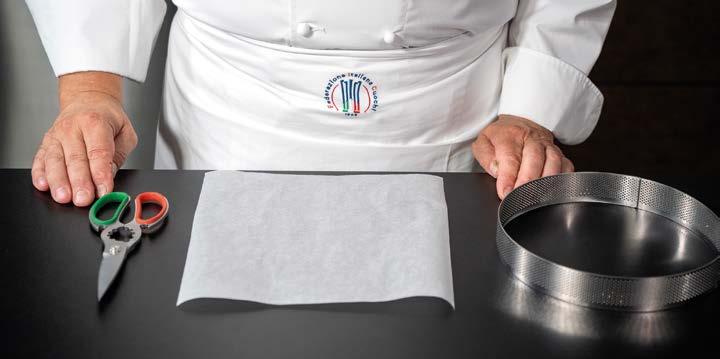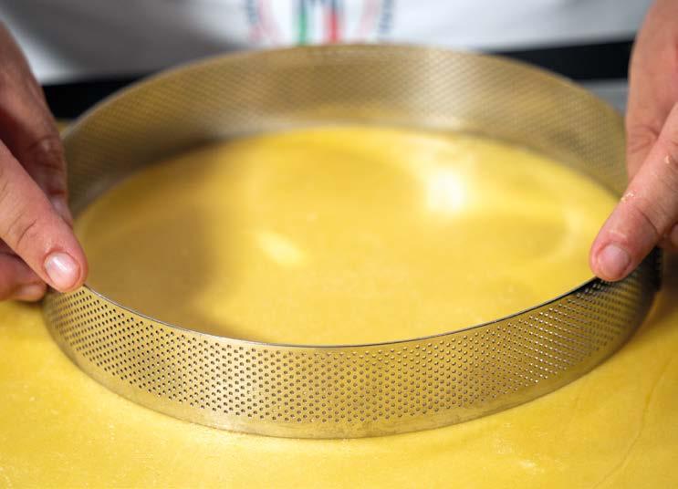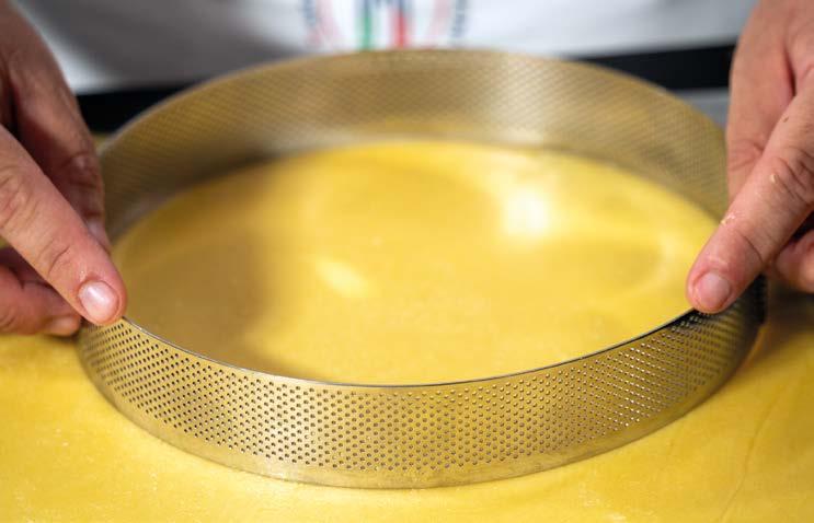 1 Stendere la frolla a circa 1 cm di spessore. Tagliare 2 dischi corrispondenti alla base dello stampo (del diametro di 18 cm) e, aiutandosi con il matterello, adagiare la pasta all’interno degli stampi.