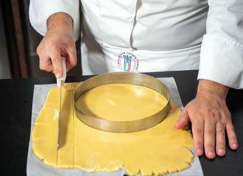 2 Con altra pasta formare un “cordone” della dimensione di un dito. Adagiare il cordone negli stampi contornando il bordo. Premere bene e decorare a piacere con una forchetta. Usare 2 teglie da 20 cm di diametro per ottenere 6 fette per stampo e facilitare il servizio.