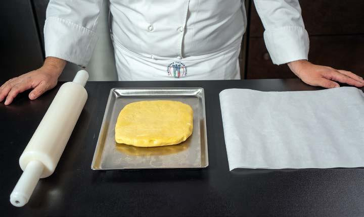 Rivestire l’interno di uno stampo, debitamente imburrato e infarinato, con una pasta (sfoglia, frolla e brisée).