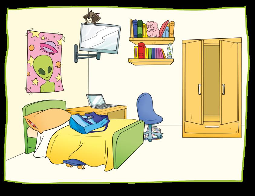 Esta es mi casa. ¡Mira! El salón, la cocina, el baño, mi dormitorio y la entrada. Mi cabaña está en el jardín. Pero… ¿dónde